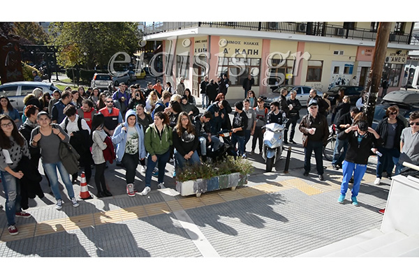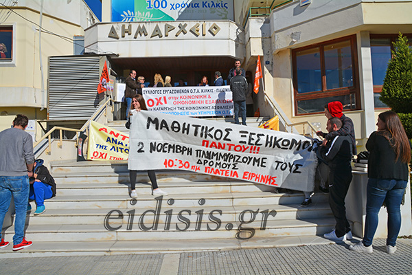 Η κινητοποίηση στο δημαρχείο Κιλκίς είχε και τη συμπαράσταση των μαθητών του 1ου Λυκείου και 1ου ΕΠΑΚ Κιλκίς, οι οποίοι από την Τρίτη έχουν προχωρήσει σε κατάληψη των σχολείων τους και το πρωί της Τετάρτης προχώρησαν σε πορεία στο κέντρο του Κιλκίς.
