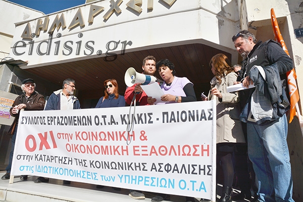 Σε συμβολική κατάληψη των δημαρχείων Κιλκίς και Παιονίας προχώρησαν οι δημοτικοί υπάλληλοι του νομού, στα πλαίσια πανελλαδικής κινητοποίησης, ενόψει των επικείμενων μεταρρυθμίσεων στο Ασφαλιστικό, προαπαιτούμενο για την εφαρμογή του 3ου Μνημονίου και την εκταμίευση της υποδόσης των 2 δις Ευρώ, και την ενδεχόμενη κατάργηση των Βαρέων & Ανθυγιεινών σε συναδέλφους τους.
