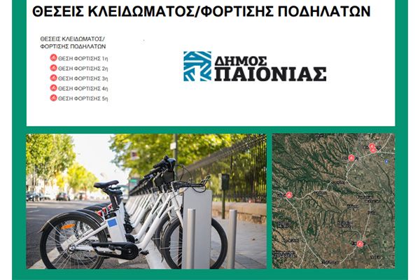 - Δημιουργία δικτύου 5 σημείων, κοινόχρηστων θέσεων κλειδώματος και φόρτισης ποδηλάτου, με δυνατότητα αυτόματης φόρτισης του ποδηλάτου όσο είναι κλειδωμένο. (Πολύκαστρο , Γουμένισσα, Αξιούπολη, Εύρωπο).