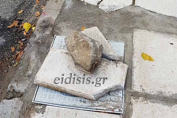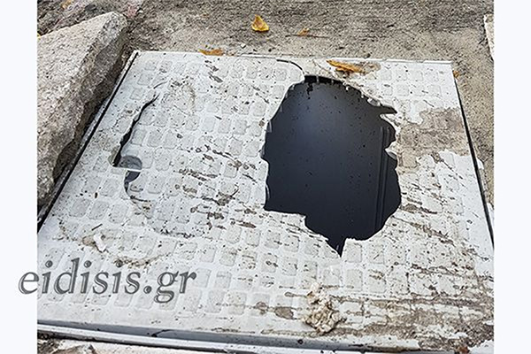 Στη δεύτερη φωτογραφία το φρεάτιο καλυμμένο με πρόχειρα σπαράγματα τσιμεντόπλακας από πολίτες της περιοχής. Για να προστατεύσουν εαυτούς και αλλήλους.