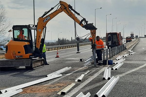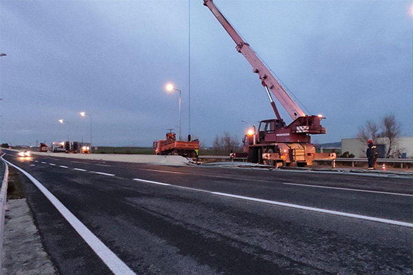 Σήμερα, Τρίτη 22 Φεβρουαρίου 2022, πραγματοποιήθηκαν οι εργασίες αφαίρεσης των προσωρινών στηθαίων και ξεκίνησε η τοποθέτηση νέων, αμφίπλευρων χαλύβδινων στηθαίων, που πληρούν όλες τις προδιαγραφές για την ασφάλεια των διερχομένων οδηγών και οχημάτων επί του οδικού δικτύου.