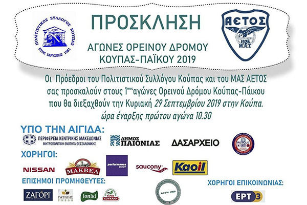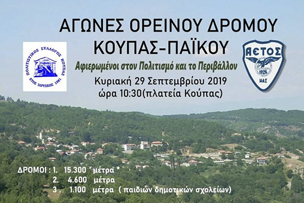 Τους Αγώνες Ορεινού Δρόμου Κούπας – Πάικου 2019 διοργανώνουν ο Πολιτιστικός Σύλλογος Κούπας και ο ΜΑΣ ΑΕΤΟΣ, την Κυριακή 29 Σεπτεμβρίου.