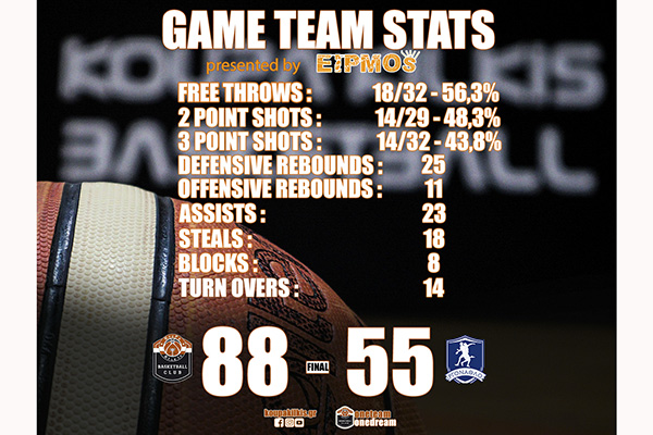Ακόμα μια νίκη 30 plus για τη ομάδα μας (η 6η σε 8 αγώνες). Ανταποκρίθηκε πολύ καλά στην επίθεση με τα 23 από τα 28 σουτ εντός πεδιάς να προέρχονται από τελική πάσα, κάτι που σημαίνει πως το 82% των πόντων της ομάδας προήλθαν από συνεργασία και μόλις το 18% από ατομικές ενέργειες. Η στατιστική αποτύπωση των 18 κλεψιμάτων και των 8 κοψιμάτων είναι εξίσου εντυπωσιακή, δεν μπορεί ωστόσο να καταγράψει τις στιγμές που «κοιμήθηκε» η άμυνα και δεν προσαρμόστηκε στις επιθετικές προσαρμογές του Εργόναθλου.