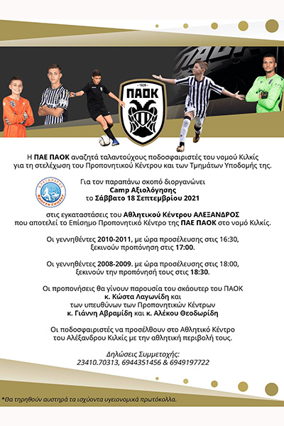 Το Επίσημο Προπονητικό Κέντρο της ΠΑΕ ΠΑΟΚ ανοίγει τις πύλες του και φιλοξενεί το 1ο Camp αξιολόγησης των "ασπρόμαυρων". Το Alexandros Sports Center υποδέχεται τους γεννηθέντες 2010-2011 οι οποίοι προπονούνται το Σάββατο 18 Σεπτεμβρίου στις 16.30, και τους γεννηθέντες το 2008-2009 που θα προπονηθούν στις 18.00 το απόγευμα, κάτω από τις οδηγίες του Scouter του ΠΑΟΚ Κώστα Λαγωνίδη και των υπευθύνων προπονητικών κέντρων Γ. Αβραμίδη και Α. Θεοδωρίδη.