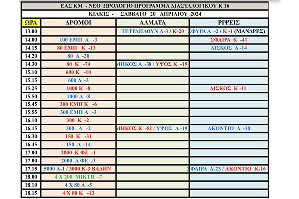 Οι αγώνες ξεκινούν στις 13:00 με αγωνίσματα αλμάτων στο Δημοτικό Στάδιο και ταυτόχρονα ρίψεις σφύρας στο γήπεδο των Μανδρών και ολοκληρώνονται στις 18:10 με αγωνίσματα δρόμου.