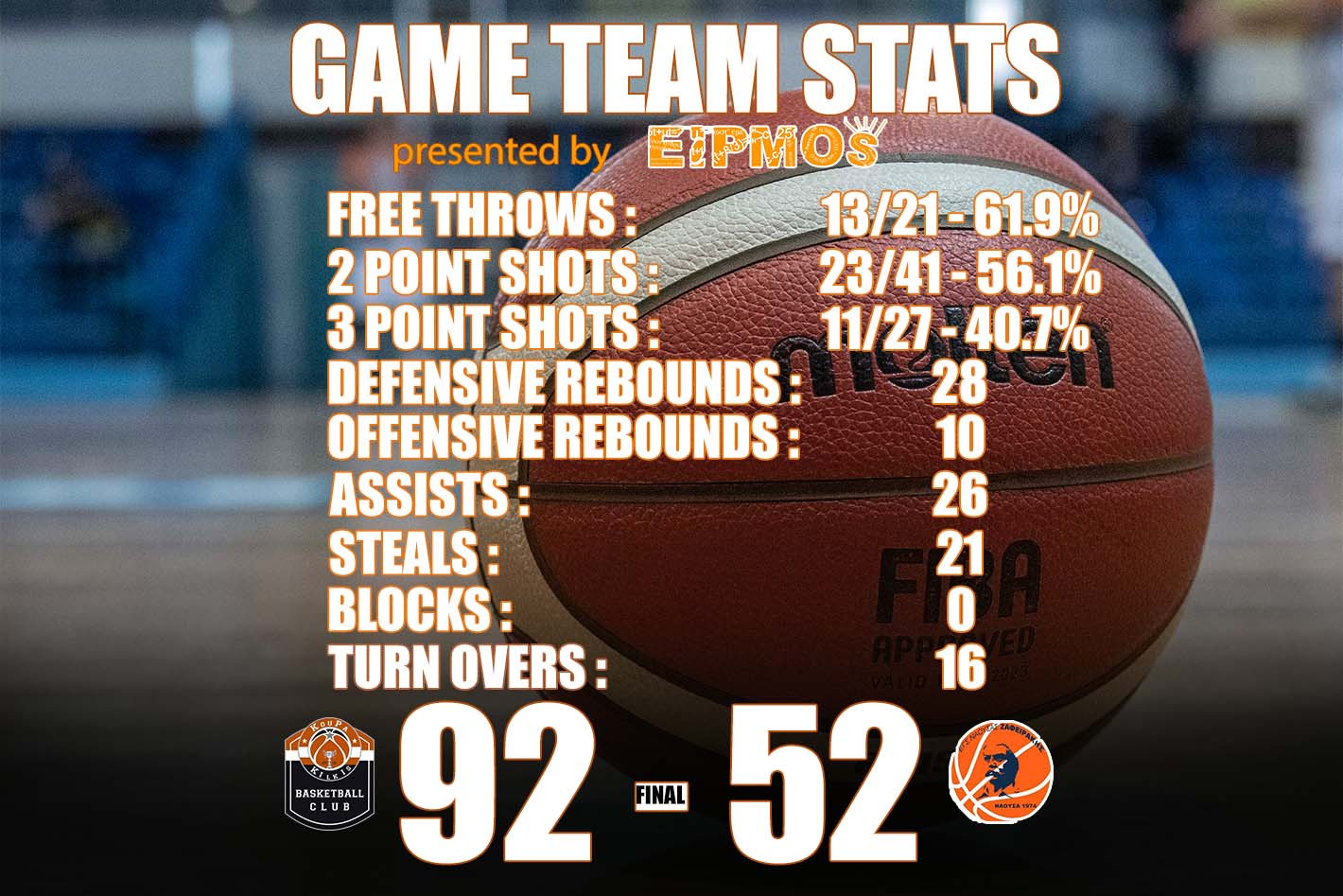 Εντυπωσιακά υπήρξαν και τα νούμερα του αγώνα του Σαββάτου. Χαρακτηριστικότερο όλων οι 26 ασίστ, δείγμα της ομαδικής συμπεριφοράς, του αλτρουισμού των παικτών, αλλά και των πολλών αιφνιδιασμών που πραγματοποιήθηκαν. Τα 21 κλεψίματα αποτελούν ακόμα μια εντυπωσιακή επίδοση και αποδεικνύουν τη διάθεση που επέδειξαν όλοι ανεξαιρέτως στην άμυνα. Τα ποσοστά ευστοχίας υπήρξαν εξίσου ικανοποιητικά με 56% στα δίποντα και σχεδόν 41% στα τρίποντα.