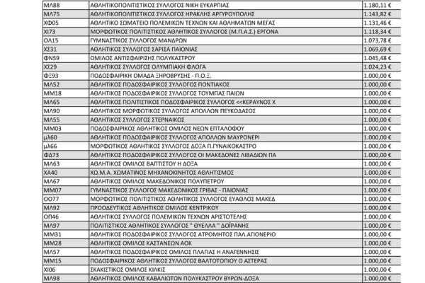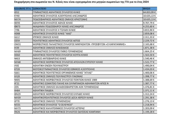 Μεταξύ αυτών περιλαμβάνονται 61 αθλητικά σωματεία του ν. Κιλκίς τα οποία χρηματοδοτούνται με μέγιστο τα 64.833 ευρώ του ΓΑΣΚ έως τα 1.000 ευρώ τα οποία λαμβάνουν τα περισσότερα σωματεία.