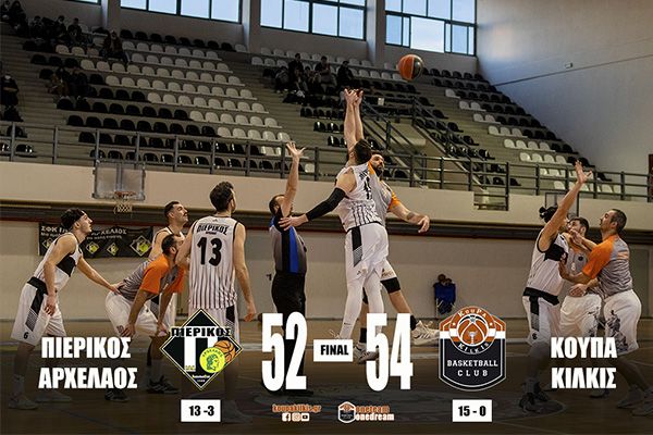 Ήταν το υψηλότερης δυσκολίας παιχνίδι. Η πρώτη αντιμετώπιζε εκτός έδρας τη δεύτερη ομάδα του ομίλου. Η τελική επικράτηση με το ισχνό 52 -54 ήρθε μετά από πολύ κόπο. Το παιχνίδι ξεκίνησε αναγνωριστικά για τις δύο ομάδες. Η γηπεδούχος ομάδα του Πιερικού Αρχέλαου προηγήθηκε πεντέμισι λεπτά πριν το τέλος της πρώτης περιόδου με 8 – 4. Αυτή ήταν και η μοναδική φορά που τέθηκε επικεφαλής του αγώνα. Η ΚουΠα Κιλκίς με ένα 7 – 0 προσπέρασε (8 – 11) και οδήγησε την κούρσα μέχρι τέλους. Η ένταση, το πάθος και η θέληση για τη νίκη, οι δυνατές μονομαχίες συνοδευόμενες εκατέρωθεν από μία γενική αστοχία χρωμάτισαν έντονα τις προσπάθειες των δύο ομάδων. Η ΚουΠα Κιλκίς στάθηκε πιο ψύχραιμη, περισσότερο συγκεντρωμένη με λιγότερες άτυχες στιγμές από την αντίπαλο της. Η επιμονή της εν τέλει τη δικαίωσε. Το παιχνίδι παιζόταν καθόλη τη διάρκειά του στην κόψη του ξυραφιού. Η ομάδα μας αν και προηγούμενη μέχρι το τέλος δεν κατάφερε να εκμεταλλευτεί τις διαφορές που δημιούργησε, (21 – 31 στο δεύτερο δεκάλεπτο και 30 – 38 στο τρίτο). Παράλληλα η αστοχία της δυστυχώς δυνάμωνε την αυτοπεποίθηση των γηπεδούχων που δεν σταμάτησαν ποτέ να κυνηγούν και να διεκδικούν το παιχνίδι. Το τελικό 52 – 54 δεν ήρθε εύκολα, ήρθε όμως δίκαια. Η ομάδα μας στηρίχτηκε στις μπασκετικές προσωπικότητες των παιχτών της, στάθηκε περισσότερο συγκεντρωμένη στις κρίσιμες στιγμές του αγώνα, έκανε τα λιγότερα λάθη και ολοκλήρωσε με επιτυχία την αποστολή της.
