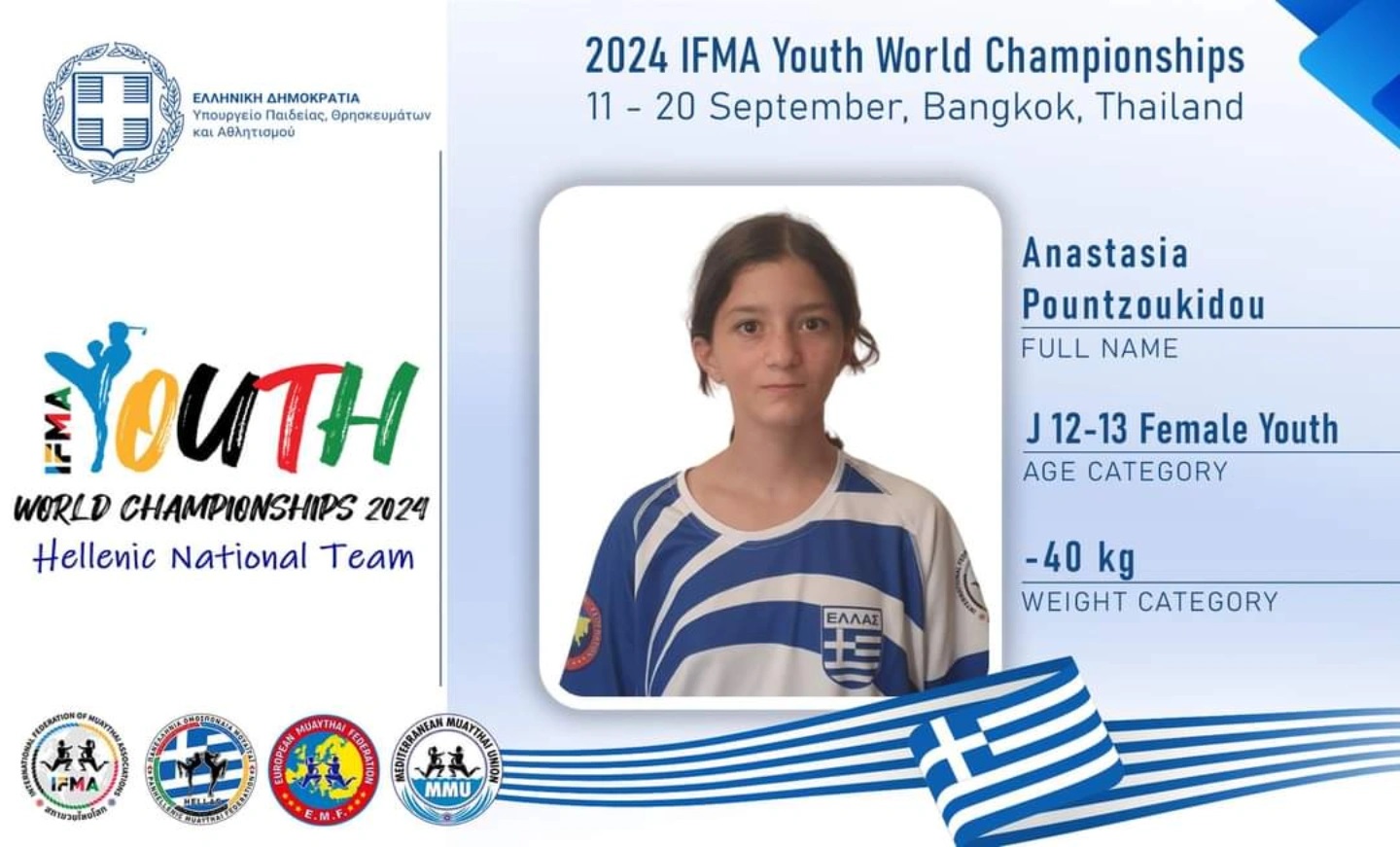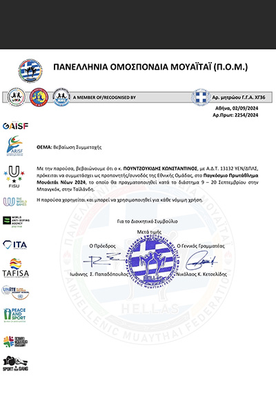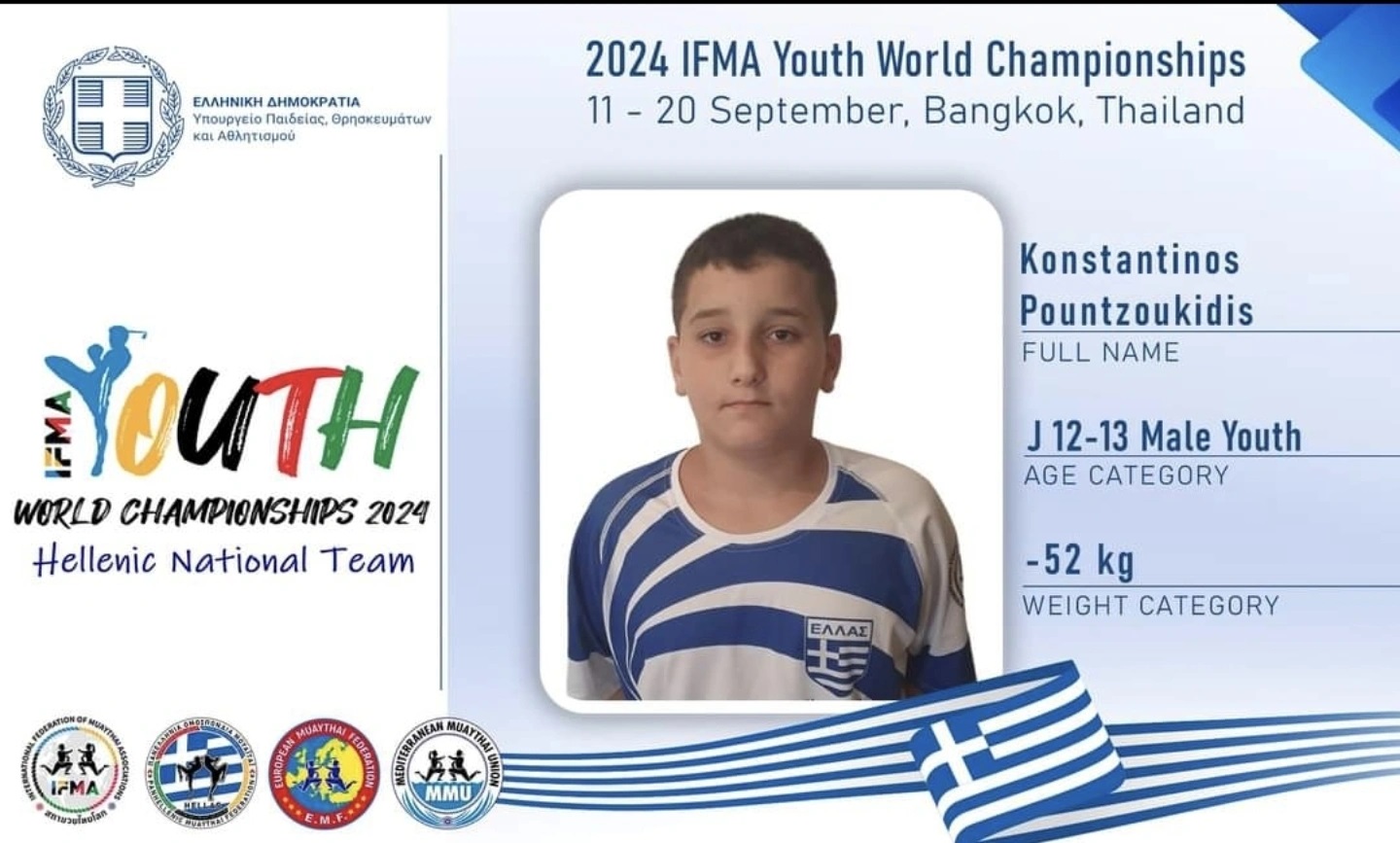 Πιο συγκεκριμένα, οι αθλητές Κωνσταντίνος Πουντζουκίδης που γεννήθηκε το 2012 θα αγωνισθεί στα -52 κιλά και η Πουντζουκίδου Αναστασία που γεννήθηκε το 2012 στα -40 κιλά θα είναι οι αθλητές θα πλαισιώσουν την αποστολή της Εθνικής ομάδας Muay Thai στο Παγκόσμιο Πρωτάθλημα Νέων που θα διεξαχθεί στην Bangkok της Ταϊλάνδης , το διάστημα από 09 έως 20 Σεπτεμβρίου 2024.