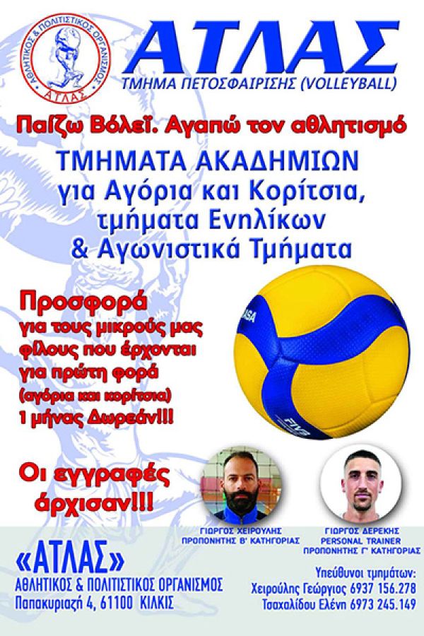Οι εγγραφές, λοιπόν, ξεκίνησαν και ο ΑΤΛΑΣ υπενθυμίζει, ότι ο πρώτος μήνας είναι δωρεάν για τους νέους και νέες αθλήτριες, δίνοντας έτσι την δυνατότητα σε παιδιά και εφήβους να δοκιμάσουν τις δυνατότητες πριν αποφασίσουν να ασχοληθούν περαιτέρω με το άθλημα. Για εγγραφές μπορείτε να επικοινωνείτε στα τηλέφωνα: 6937156278 και 6973245149 για περισσότερες πληροφορίες.