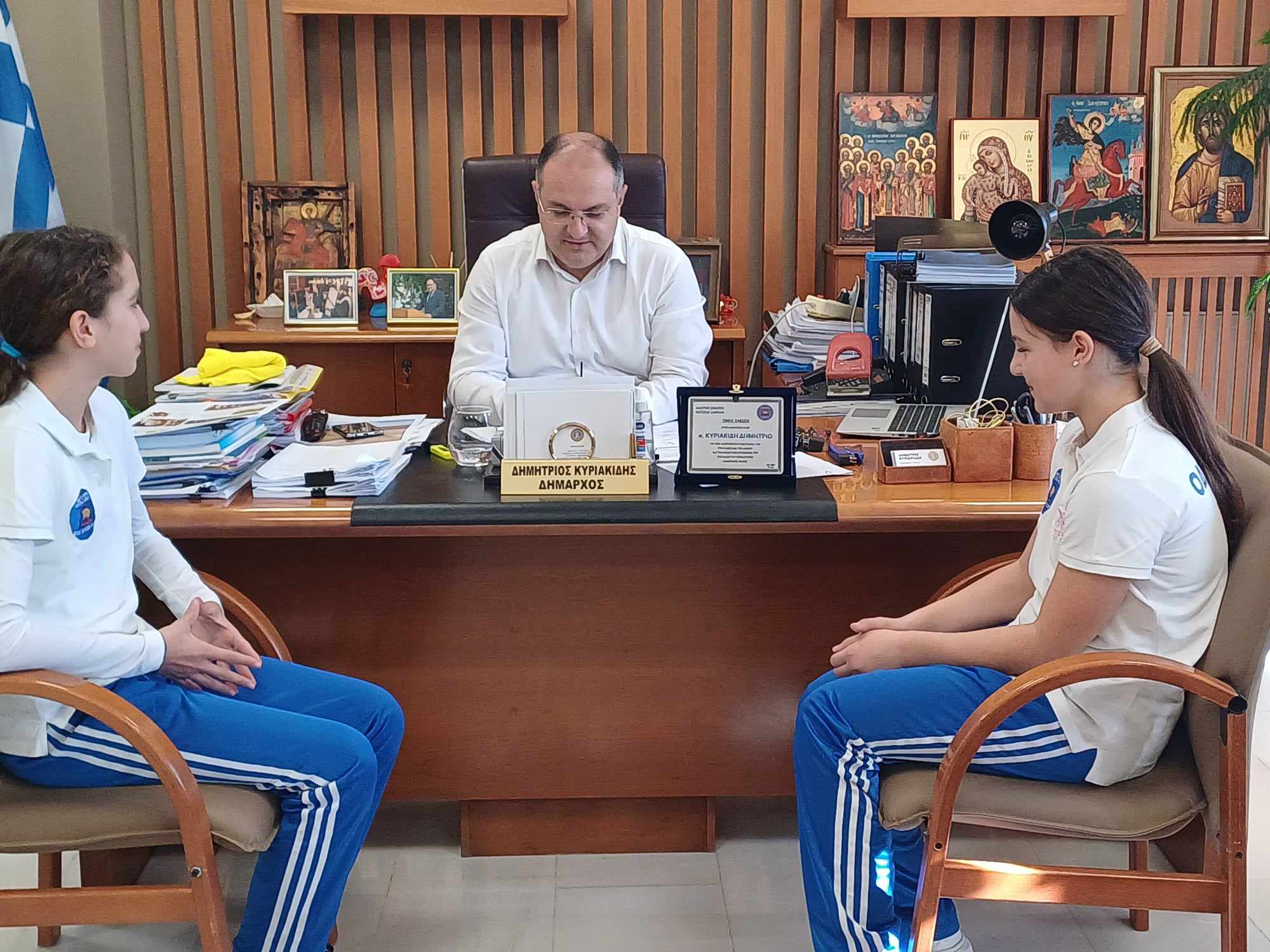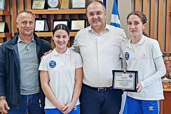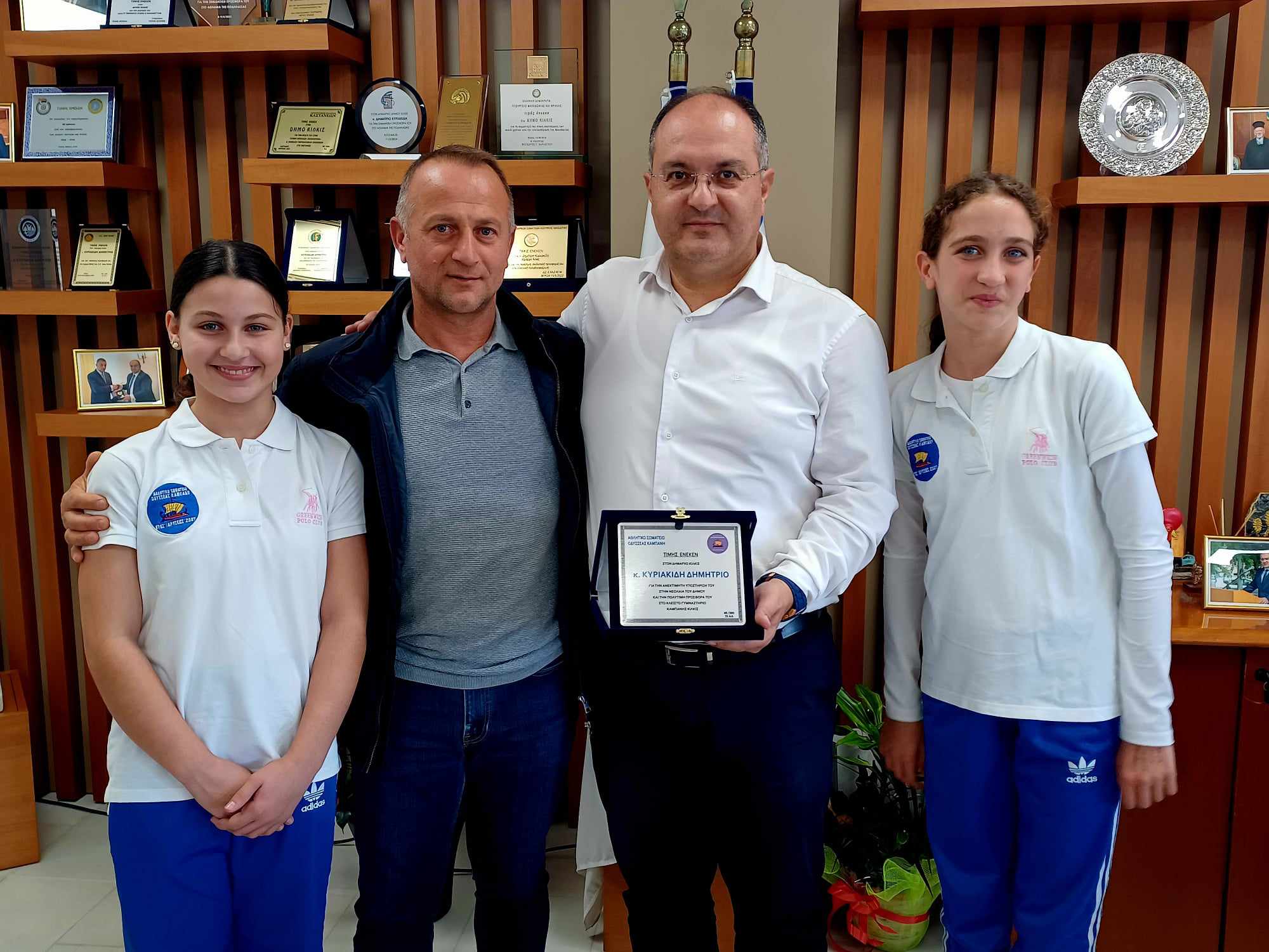 Οι δύο αθλήτριες, οι οποίες είναι μαθήτριες της α’ τάξης των Γυμνασίων Κιλκίς και Καμπάνη αντίστοιχα, θέλοντας να εκφράσουν την ευγνωμοσύνη τους στον Δήμαρχο Κιλκίς για την θετική ανταπόκρισή του στο αίτημα του Αθλητικού Σωματείου ‘’Οδυσσέας’’ σχετικά με την προμήθεια και εγκατάσταση εξοπλισμού αθλητικού τραμπολίνο στο Κλειστό Γυμναστήριο Καμπάνη, του επέδωσαν για λογαριασμό του Συλλόγου αναμνηστική πλακέτα στην οποία μνημονεύεται η υποστήριξή του στη νεολαία του Δήμου.