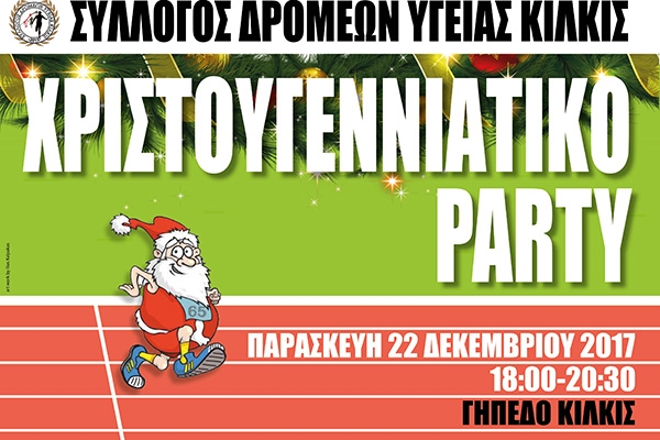 Ο Σύλλογος Δρομέων Υγείας Κιλκίς σας προσκαλεί σ’ ένα Χριστουγεννιάτικο πάρτυ διαφορετικό από τα υπόλοιπα την Παρασκευή 22 Δεκεμβρίου 2017 στο Γήπεδο του Κιλκίς στις 18:00 το απόγευμα. Ελάτε να τρέξουμε με κέφι και γιορτινή διάθεση και ντυθείτε όπως θέλετε... ακόμα και ξωτικά.