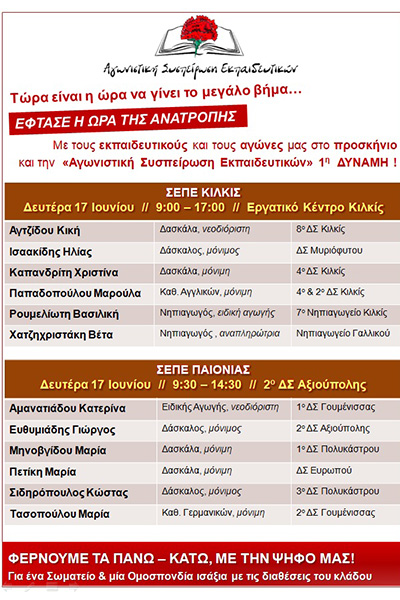 Προχωράμε μαζί! Με την «Αγωνιστική Συσπείρωση Εκπαιδευτικών» πιο δυνατή, για να νικήσει ο κλάδος στον αγώνα για μόρφωση, δουλειά, ζωή με αξιοπρέπεια.