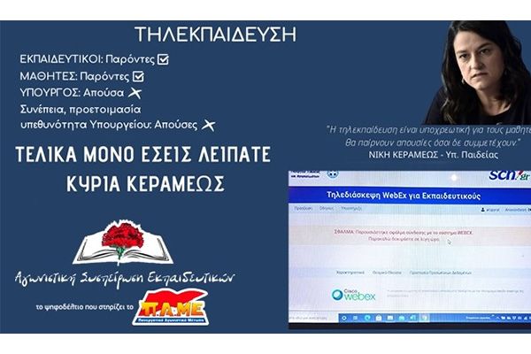 Ενώ, λοιπόν η κυβέρνηση με την πολιτική της κλείνει τα σχολεία, δεν πήρε εδώ και 8 μήνες ούτε ένα μέτρο για την τηλεκπαίδευση, παρά το γεγονός ότι τα σωματεία των εκπαιδευτικών ήδη από το Μάρτη απαιτούσαν μέτρα για τη διεξαγωγή της (τάμπλετς, λαπτοπς, γρήγορες συνδέσεις κτλ). Φυσικά το ίδιο διάστημα της εγκληματικής της αδράνειας, η πολιτική ηγεσία του ΥΠΠΑΙΘ έκοβε βόλτες στα φίλια ΜΜΕ και διαβεβαίωνε – συνειδητά και εν γνώσει της ψευδόμενη – ότι όλα πάνε ρολόι! Η μόνη τους έγνοια ήταν να μπαίνουν οι απουσίες και το προχώρημα της ύλης!