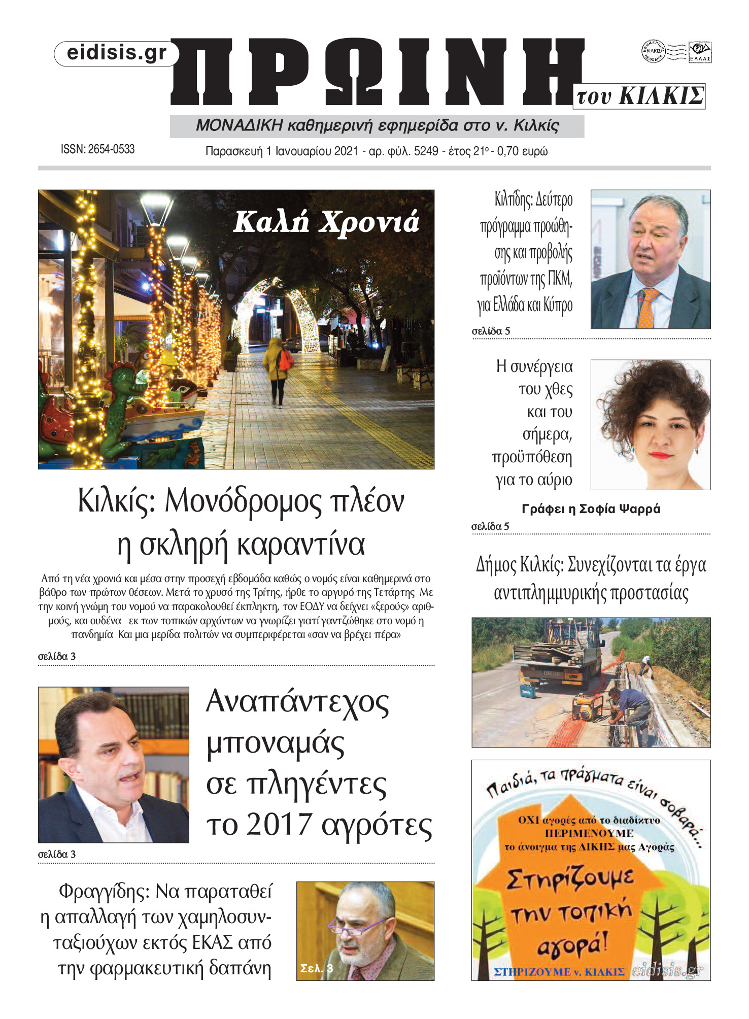 Διαβάστε το νέο πρωτοσέλιδο της Πρωινής του Κιλκίς, μοναδικής καθημερινής εφημερίδας του ν. Κιλκίς (1-1-2021)