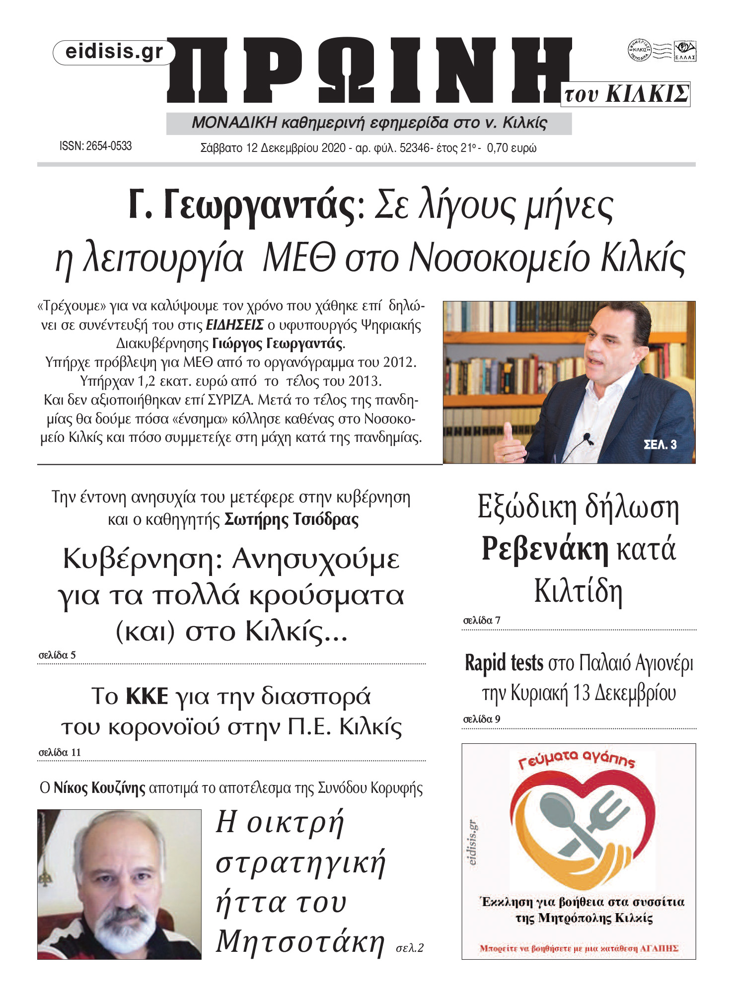 Διαβάστε το νέο πρωτοσέλιδο της Πρωινής του Κιλκίς, μοναδικής καθημερινής εφημερίδας του ν. Κιλκίς (12-12-2020)
