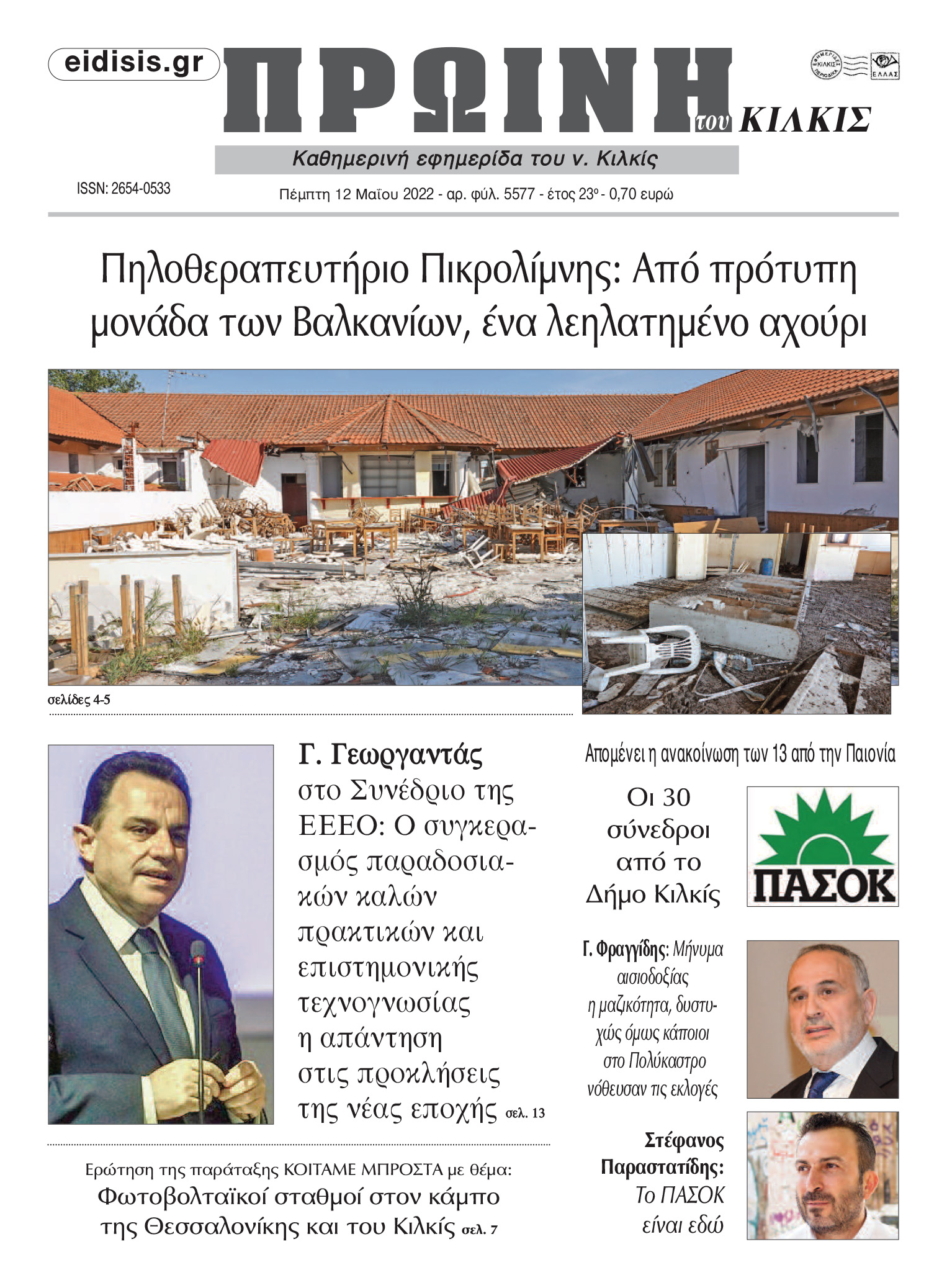 Διαβάστε το νέο πρωτοσέλιδο της Πρωινής του Κιλκίς, μοναδικής καθημερινής εφημερίδας του ν. Κιλκίς (12-5-2022)