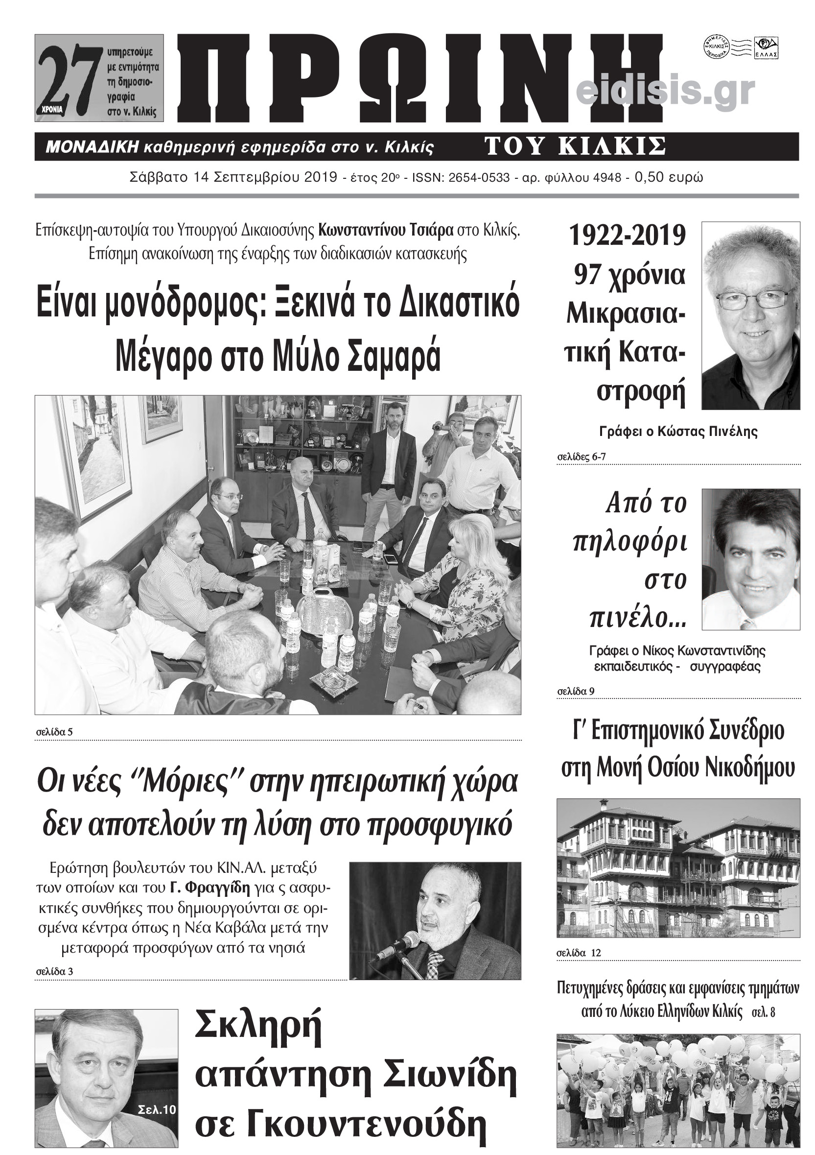 Διαβάστε το νέο πρωτοσέλιδο της Πρωινής του Κιλκίς, μοναδικής καθημερινής εφημερίδας του ν. Κιλκίς (14-9-2019)