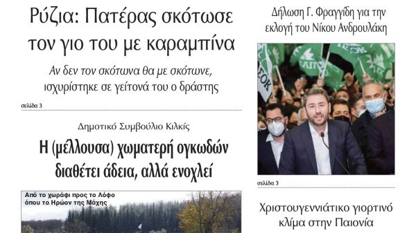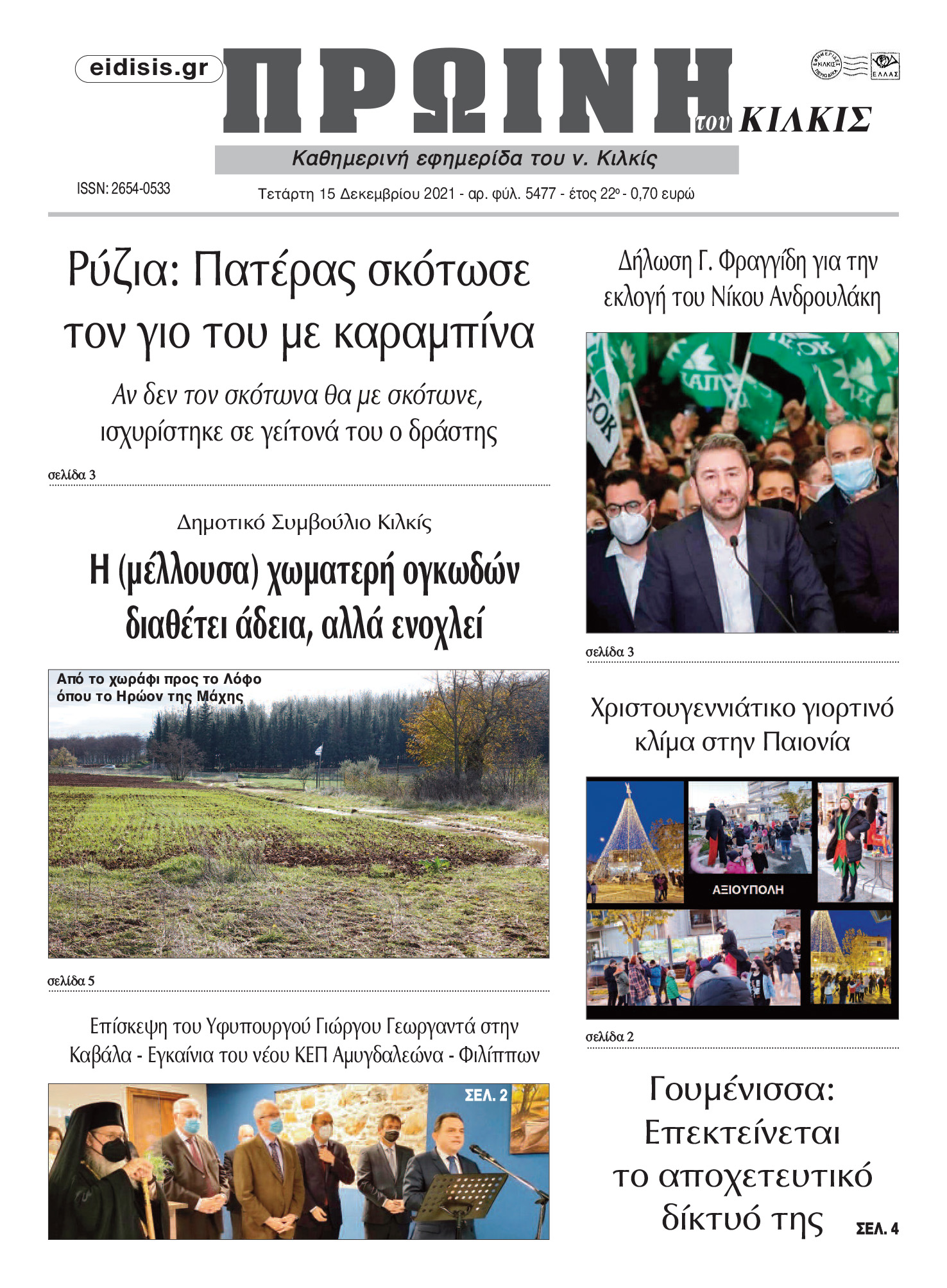 Διαβάστε το νέο πρωτοσέλιδο της Πρωινής του Κιλκίς, μοναδικής καθημερινής εφημερίδας του ν. Κιλκίς (15-12-2021)