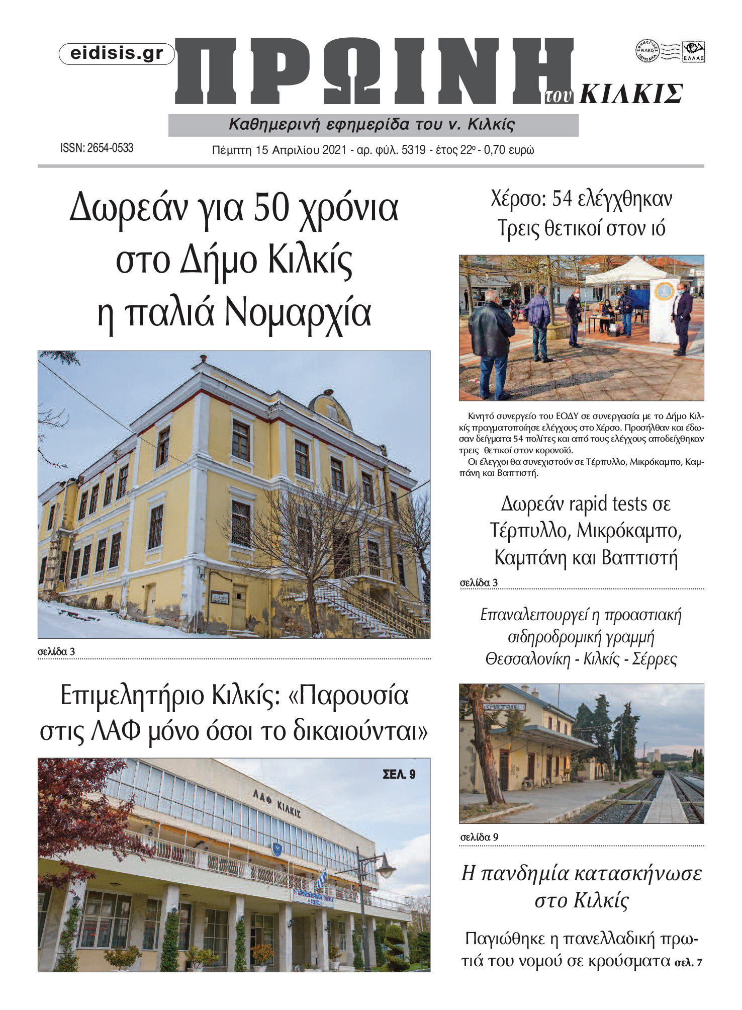 Διαβάστε το νέο πρωτοσέλιδο της Πρωινής του Κιλκίς, μοναδικής καθημερινής εφημερίδας του ν. Κιλκίς (15-4-2021)