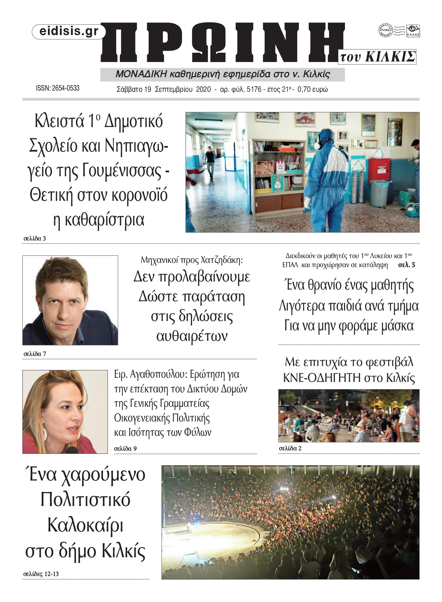 Διαβάστε το νέο πρωτοσέλιδο της Πρωινής του Κιλκίς, μοναδικής καθημερινής εφημερίδας του ν. Κιλκίς (19-9-2020)