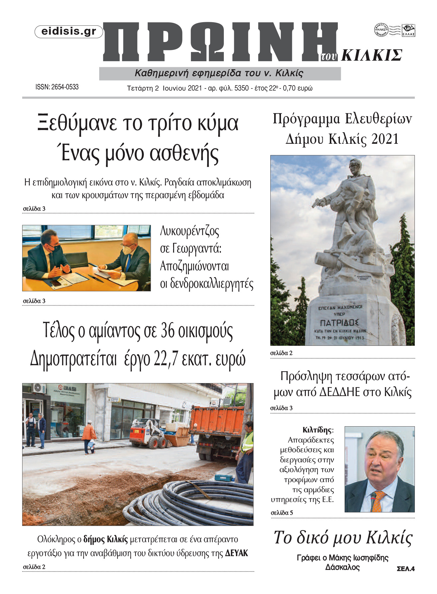 Διαβάστε το νέο πρωτοσέλιδο της Πρωινής του Κιλκίς, μοναδικής καθημερινής εφημερίδας του ν. Κιλκίς (2-6-2021)