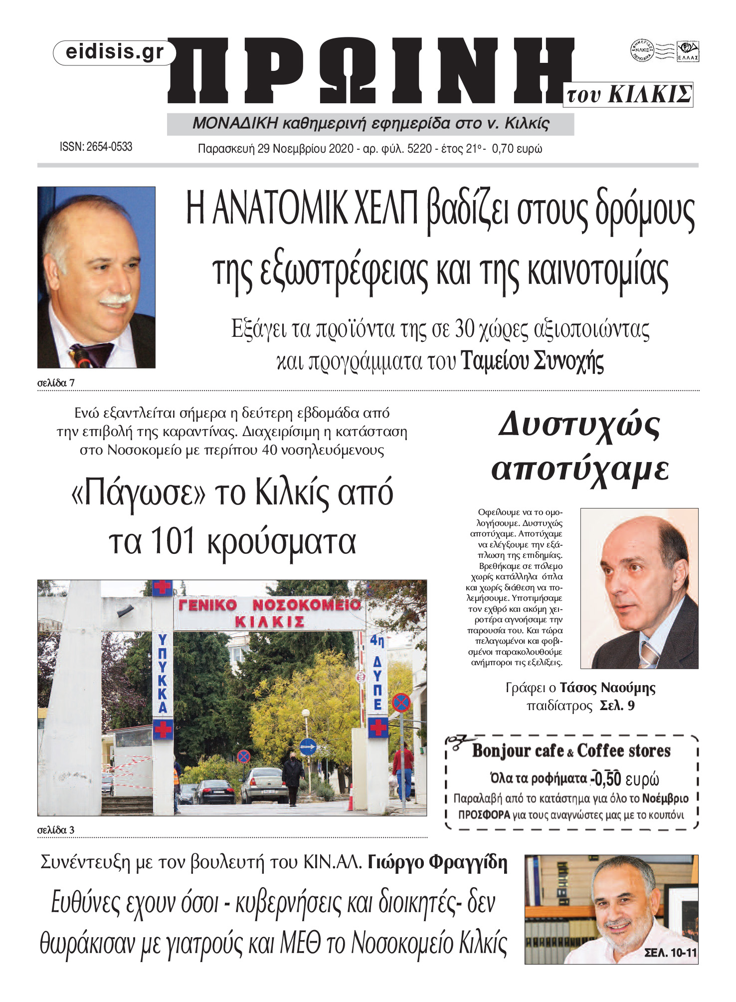 Διαβάστε το νέο πρωτοσέλιδο της Πρωινής του Κιλκίς, μοναδικής καθημερινής εφημερίδας του ν. Κιλκίς (20-11-2020)