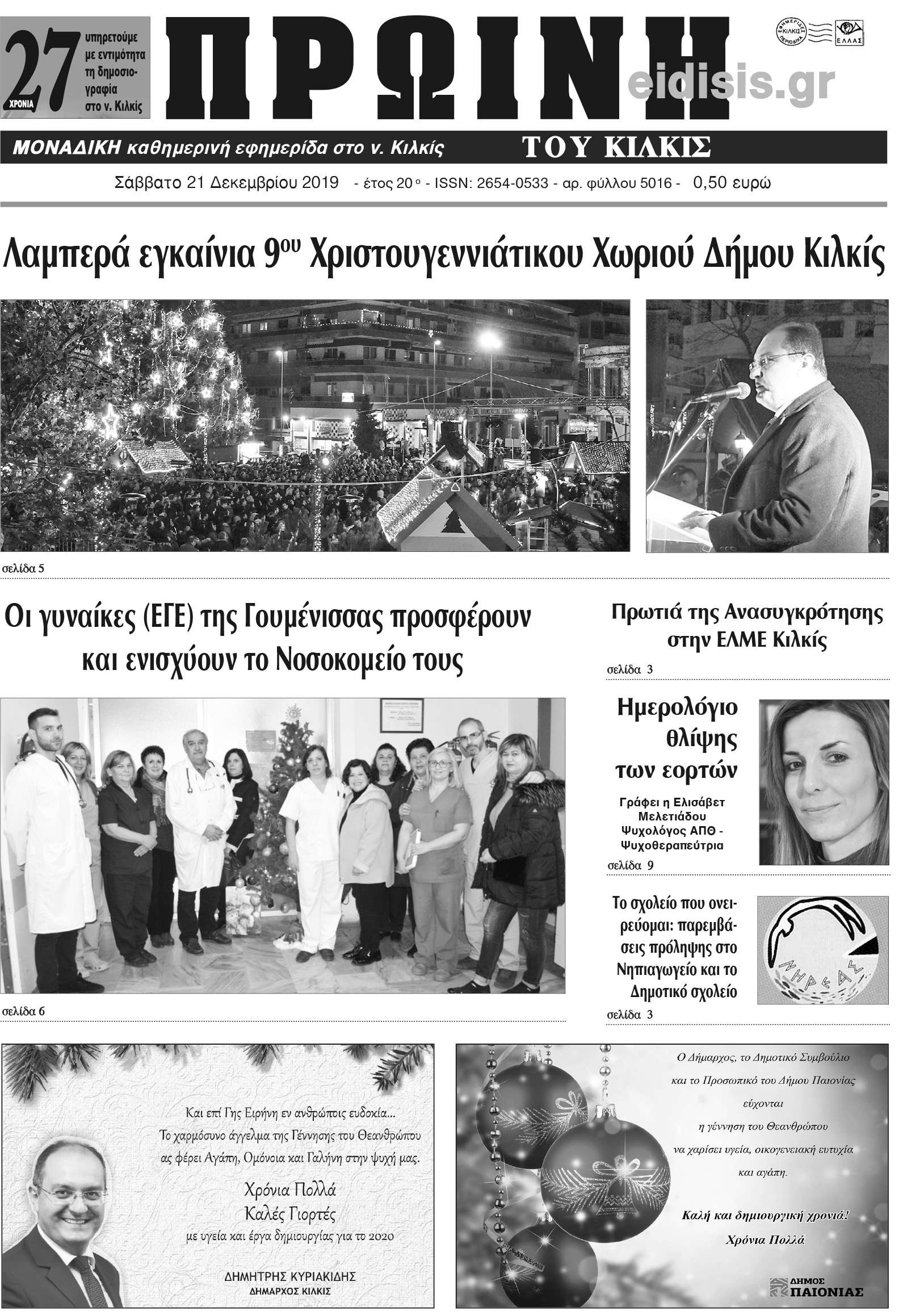 Διαβάστε το νέο πρωτοσέλιδο της Πρωινής του Κιλκίς, μοναδικής καθημερινής εφημερίδας του ν. Κιλκίς (21-12-2019)