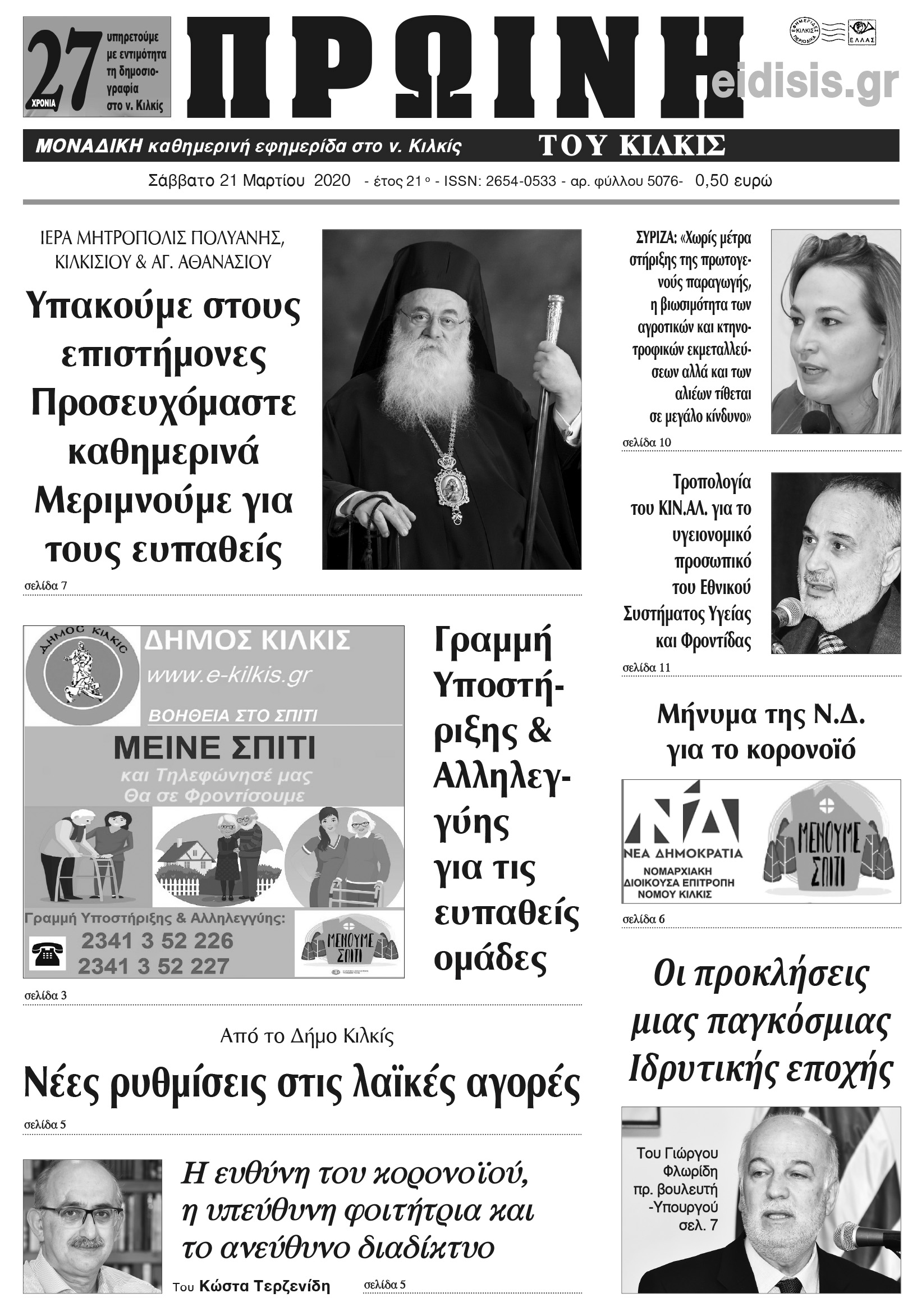Διαβάστε το νέο πρωτοσέλιδο της Πρωινής του Κιλκίς, μοναδικής καθημερινής εφημερίδας του ν. Κιλκίς (21-3-2020)