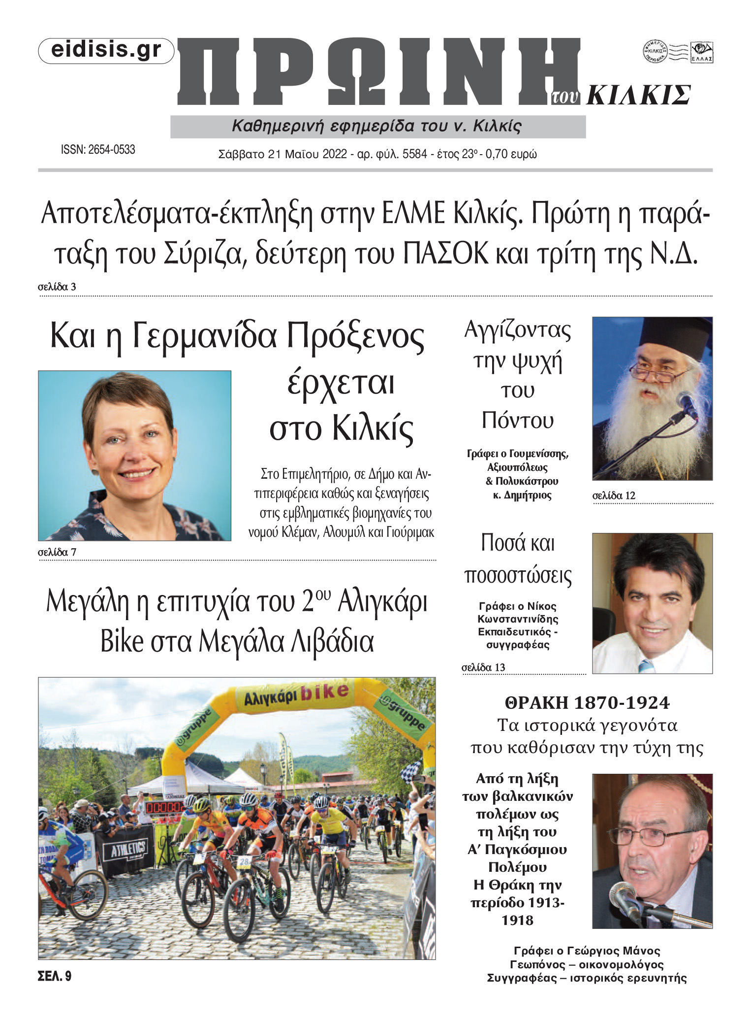 Διαβάστε το νέο πρωτοσέλιδο της Πρωινής του Κιλκίς, μοναδικής καθημερινής εφημερίδας του ν. Κιλκίς (21-5-2022)