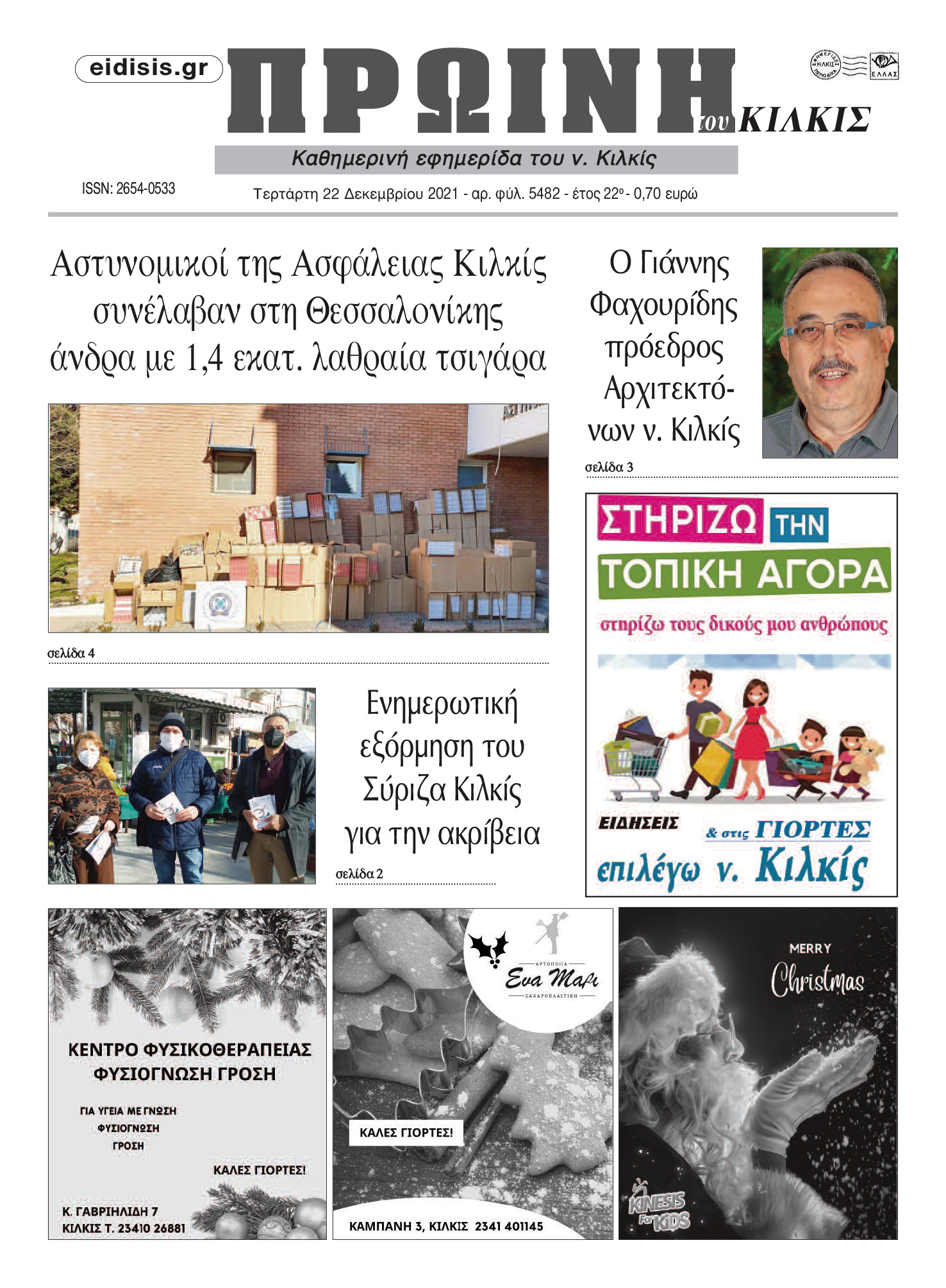 Διαβάστε το νέο πρωτοσέλιδο της Πρωινής του Κιλκίς, μοναδικής καθημερινής εφημερίδας του ν. Κιλκίς (22-12-2021)