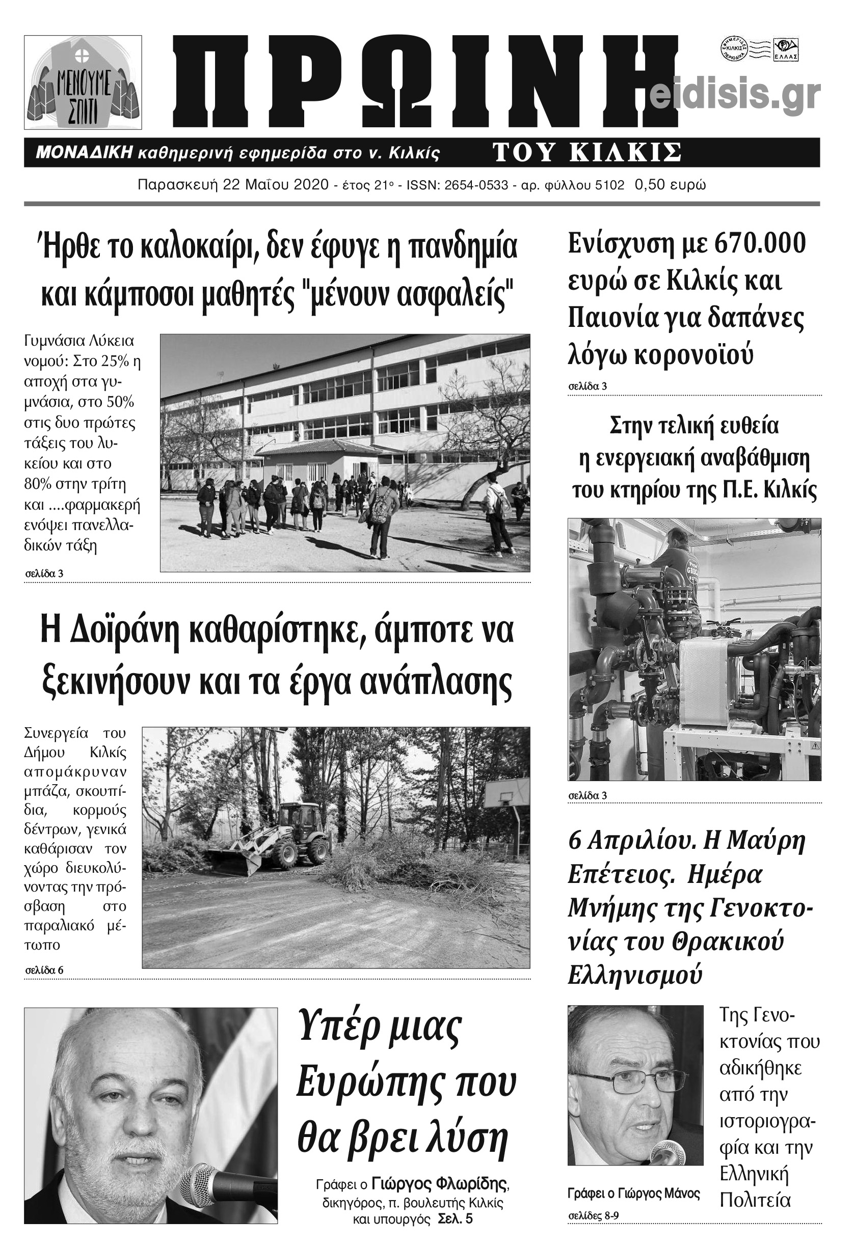 Διαβάστε το νέο πρωτοσέλιδο της Πρωινής του Κιλκίς, μοναδικής καθημερινής εφημερίδας του ν. Κιλκίς (22-5-2020)