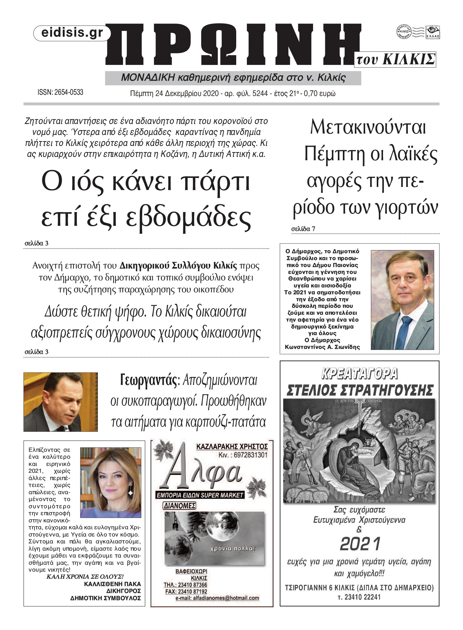Διαβάστε το νέο πρωτοσέλιδο της Πρωινής του Κιλκίς, μοναδικής καθημερινής εφημερίδας του ν. Κιλκίς (24-12-2020)