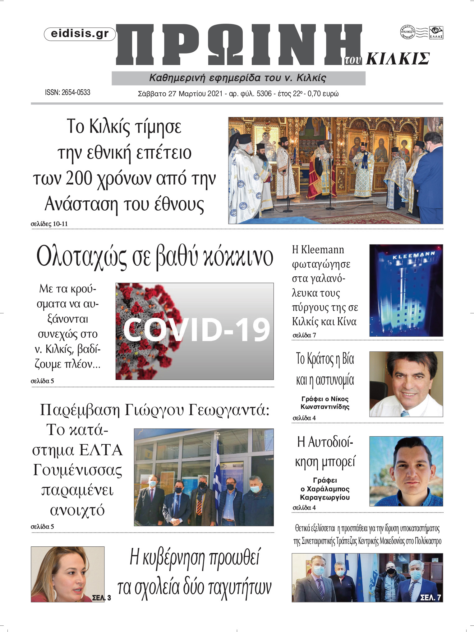 Διαβάστε το νέο πρωτοσέλιδο της Πρωινής του Κιλκίς, μοναδικής καθημερινής εφημερίδας του ν. Κιλκίς (27-3-2021)