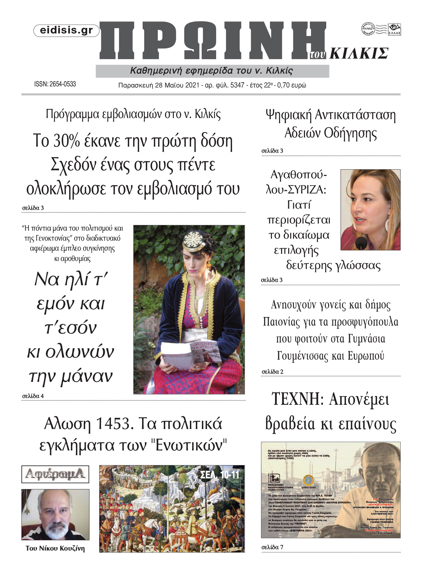 Διαβάστε το νέο πρωτοσέλιδο της Πρωινής του Κιλκίς, μοναδικής καθημερινής εφημερίδας του ν. Κιλκίς (28-5-2021)