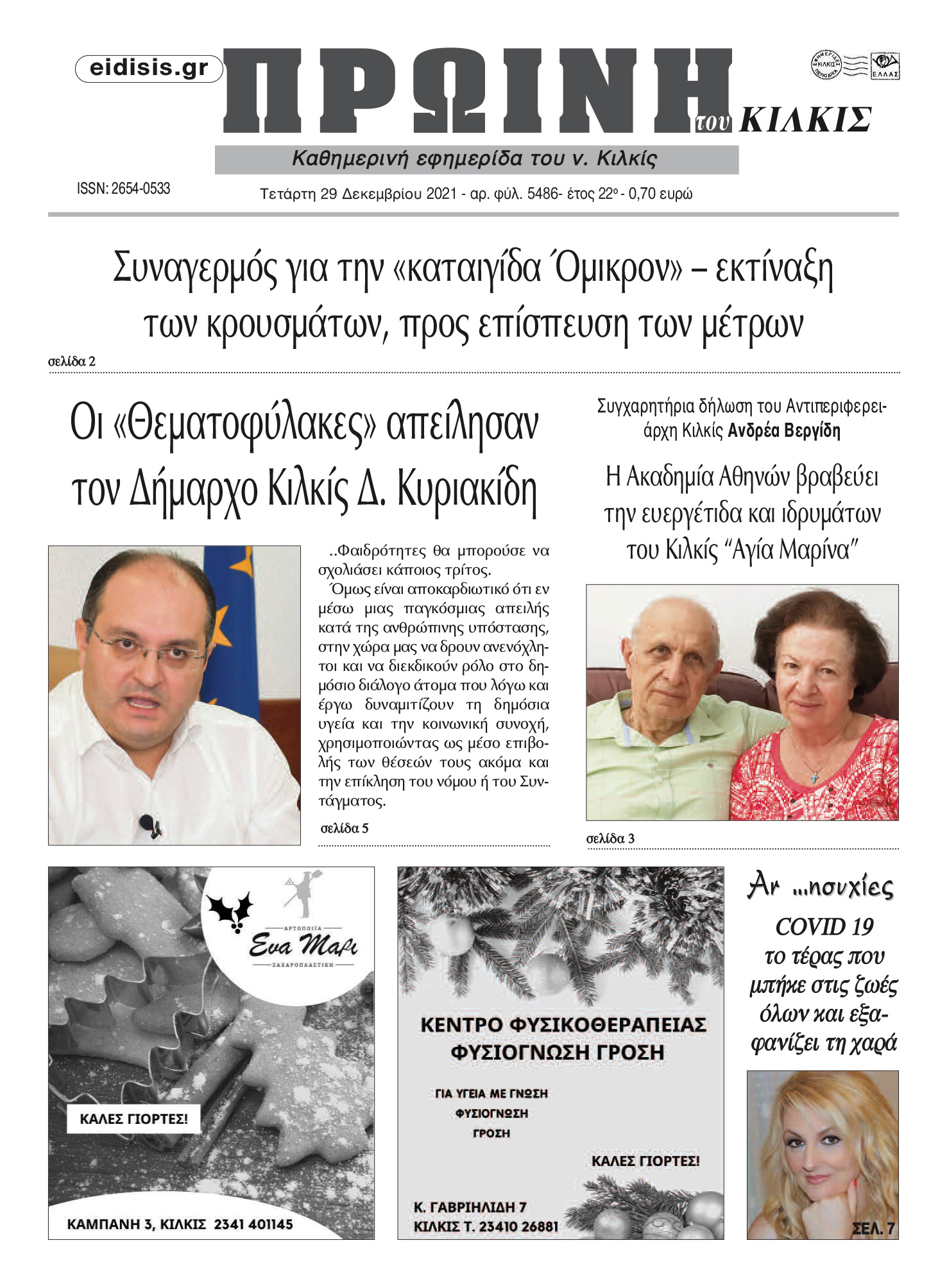 Διαβάστε το νέο πρωτοσέλιδο της Πρωινής του Κιλκίς, μοναδικής καθημερινής εφημερίδας του ν. Κιλκίς (29-12-2021)