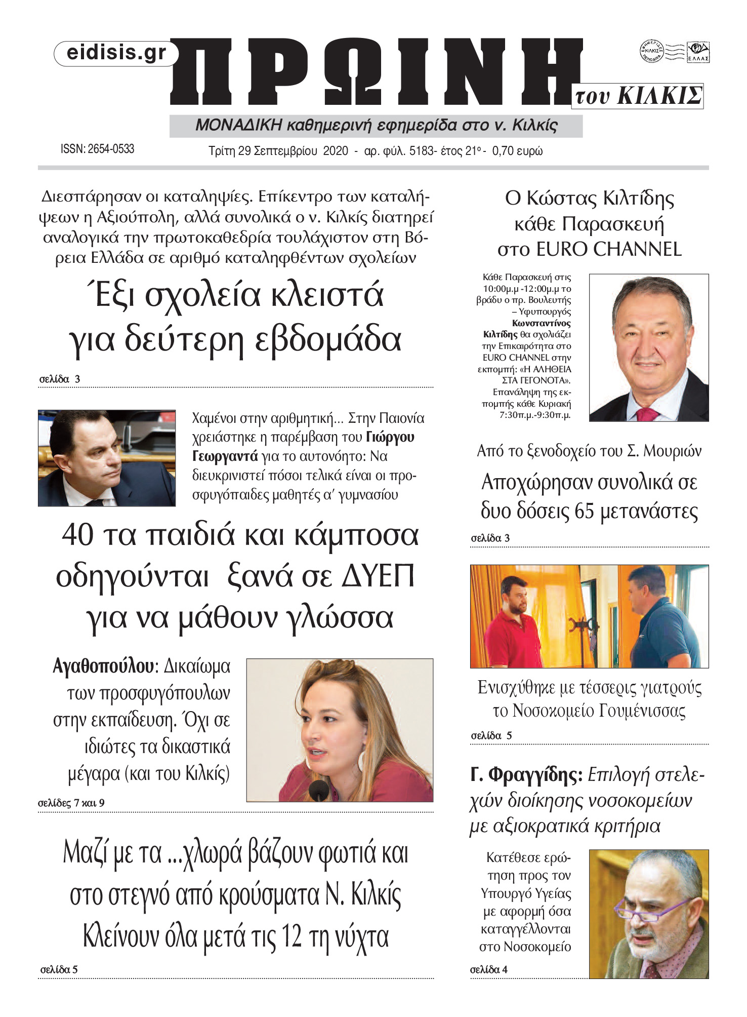 Διαβάστε το νέο πρωτοσέλιδο της Πρωινής του Κιλκίς, μοναδικής καθημερινής εφημερίδας του ν. Κιλκίς (29-9-2020)