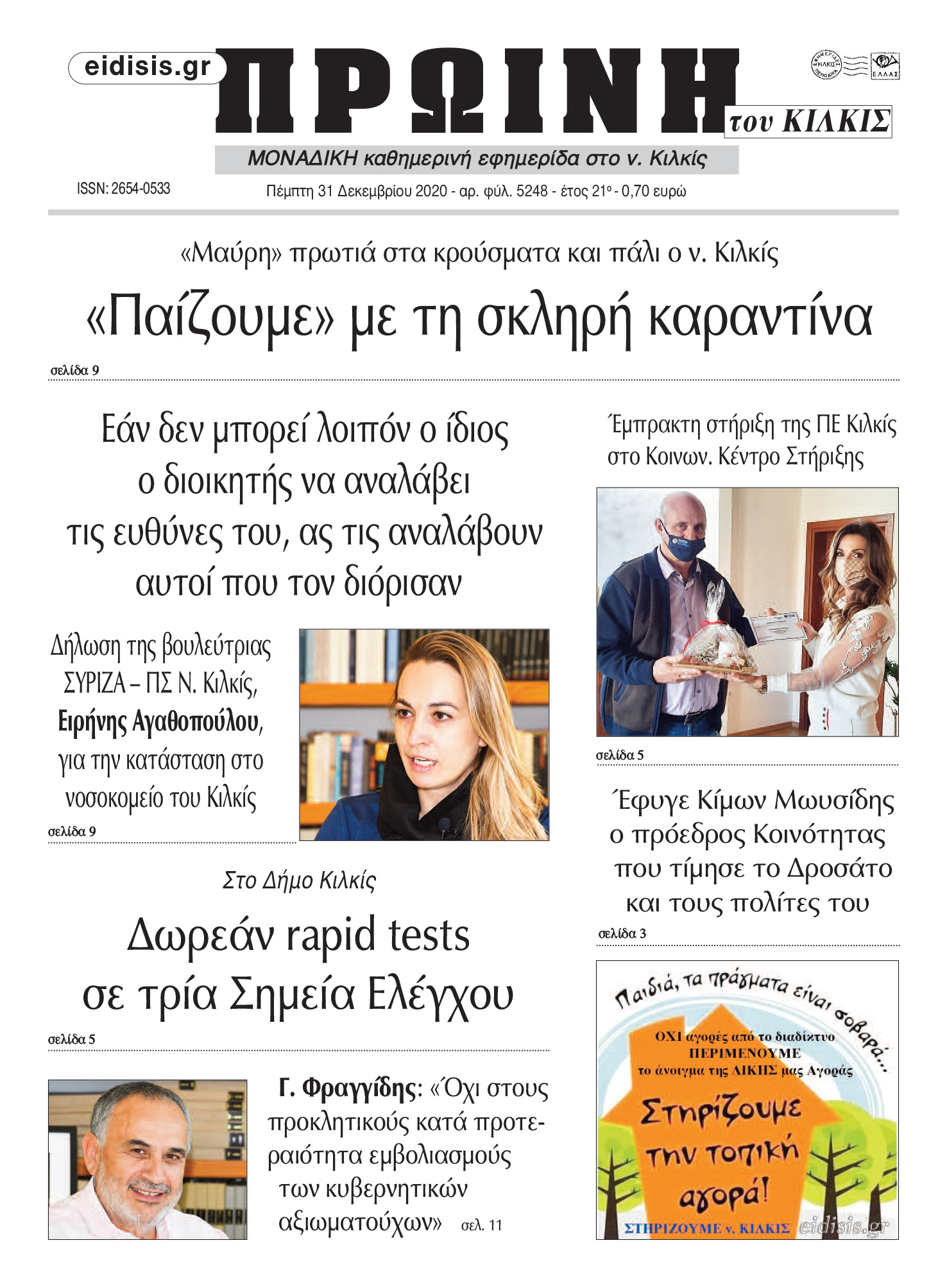 Διαβάστε το νέο πρωτοσέλιδο της Πρωινής του Κιλκίς, μοναδικής καθημερινής εφημερίδας του ν. Κιλκίς (31-12-2020)
