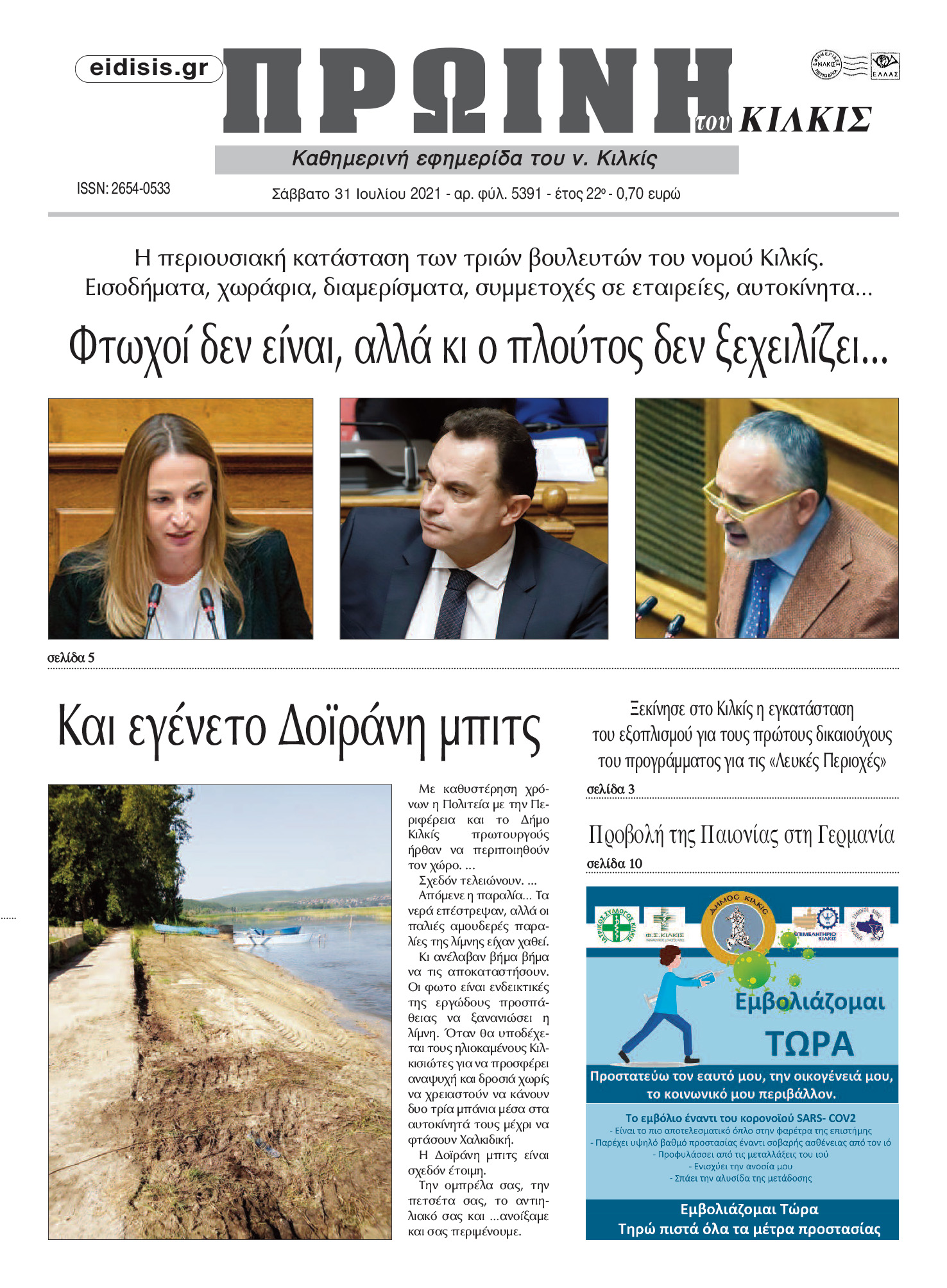 Διαβάστε το νέο πρωτοσέλιδο της Πρωινής του Κιλκίς, μοναδικής καθημερινής εφημερίδας του ν. Κιλκίς (31-7-2021)