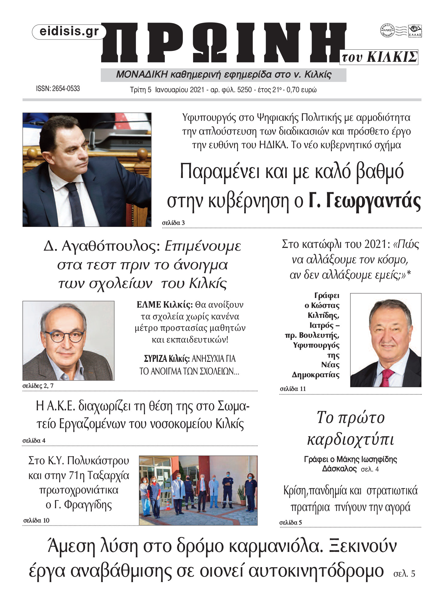 Διαβάστε το νέο πρωτοσέλιδο της Πρωινής του Κιλκίς, μοναδικής καθημερινής εφημερίδας του ν. Κιλκίς (5-1-2021)