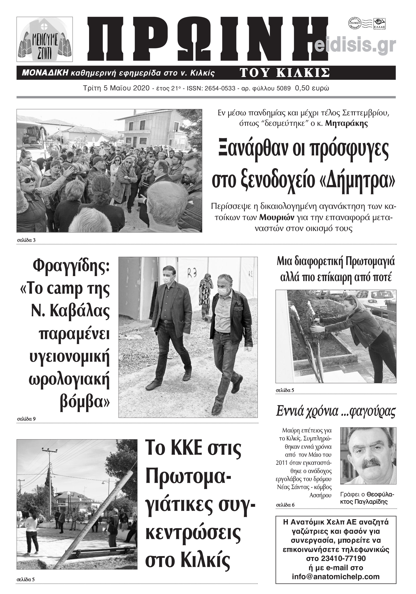 Διαβάστε το νέο πρωτοσέλιδο της Πρωινής του Κιλκίς, μοναδικής καθημερινής εφημερίδας του ν. Κιλκίς (5-5-2020)