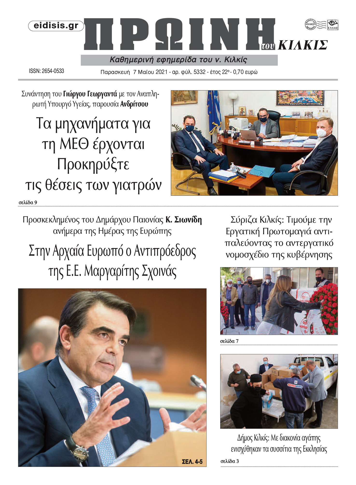 Διαβάστε το νέο πρωτοσέλιδο της Πρωινής του Κιλκίς, μοναδικής καθημερινής εφημερίδας του ν. Κιλκίς (7-5-2021)