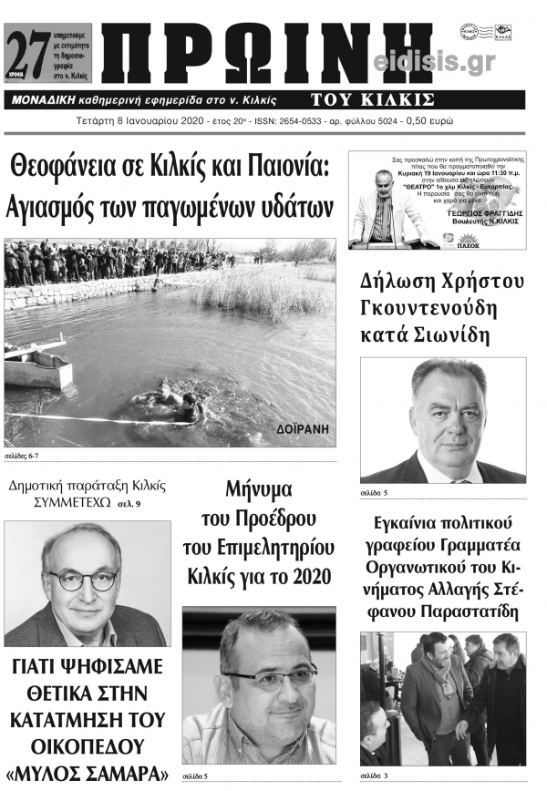 Διαβάστε το νέο πρωτοσέλιδο της Πρωινής του Κιλκίς, μοναδικής καθημερινής εφημερίδας του ν. Κιλκίς (8-1-2020).