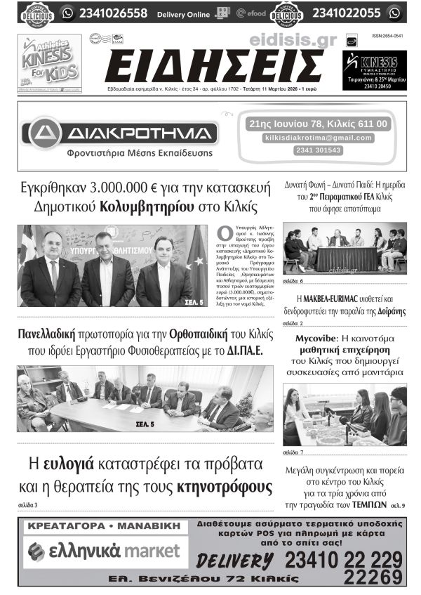 Διαβάστε το νέο πρωτοσέλιδο των ΕΙΔΗΣΕΩΝ του Κιλκίς, της εβδομαδιαίας εφημερίδας του ν. Κιλκίς (11-3-2026)