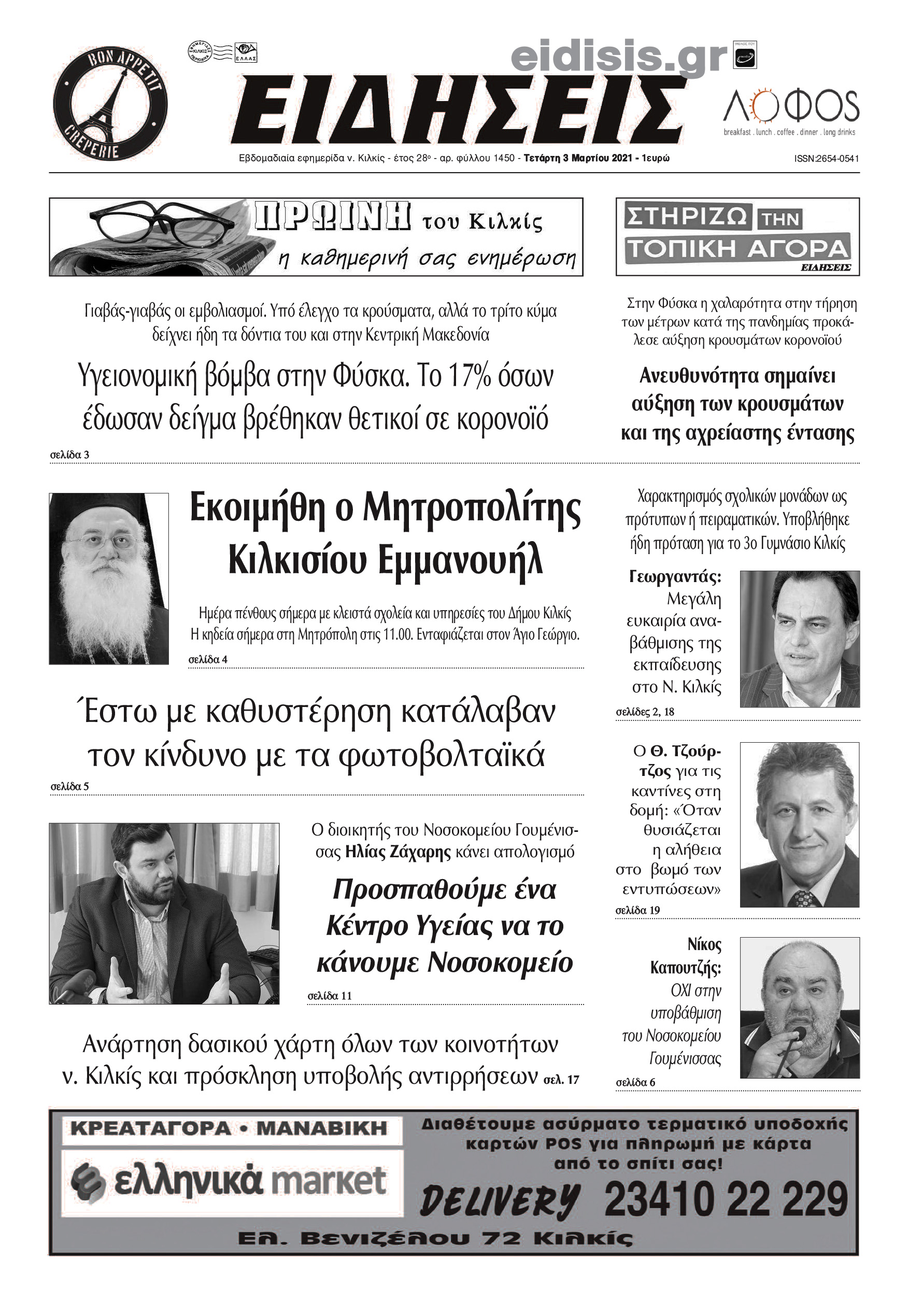 Διαβάστε το νέο πρωτοσέλιδο των ΕΙΔΗΣΕΩΝ του Κιλκίς, της εβδομαδιαίας εφημερίδας του ν. Κιλκίς (3-3-2021)