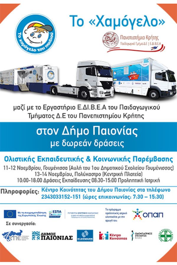 Οι δράσεις εκπαίδευσης και επιμόρφωσης υλοποιούνται στο 1ο Κινητό Εργαστήριο Ενημέρωσης, Εκπαίδευσης & Τεχνολογίας «ΟΔΥΣΣΕΑΣ» από «Το Χαμόγελο του Παιδιού», ο οποίος θα βρίσκεται σταθμευμένος στην αυλή του 1ου Δημοτικού Σχολείου Γουμένισσας (11 & 12/11) και στην Κεντρική Πλατεία Πολύκαστρου (13 & 14/11).