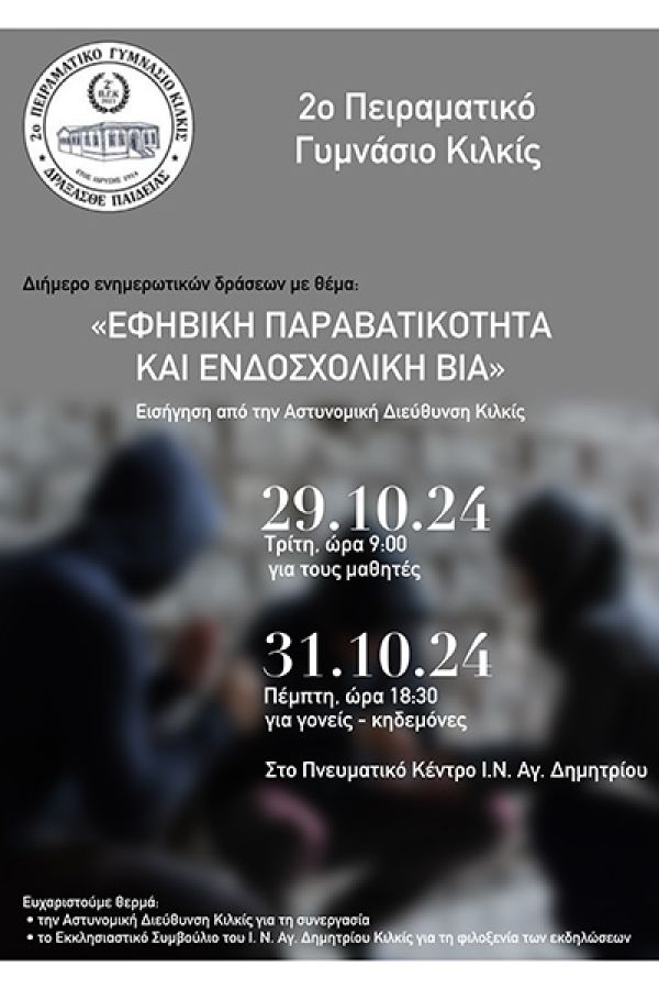 - την Τρίτη 29-10-2024, για τους μαθητές του 2ου Πειραματικού Γυμνασίου Κιλκίς και