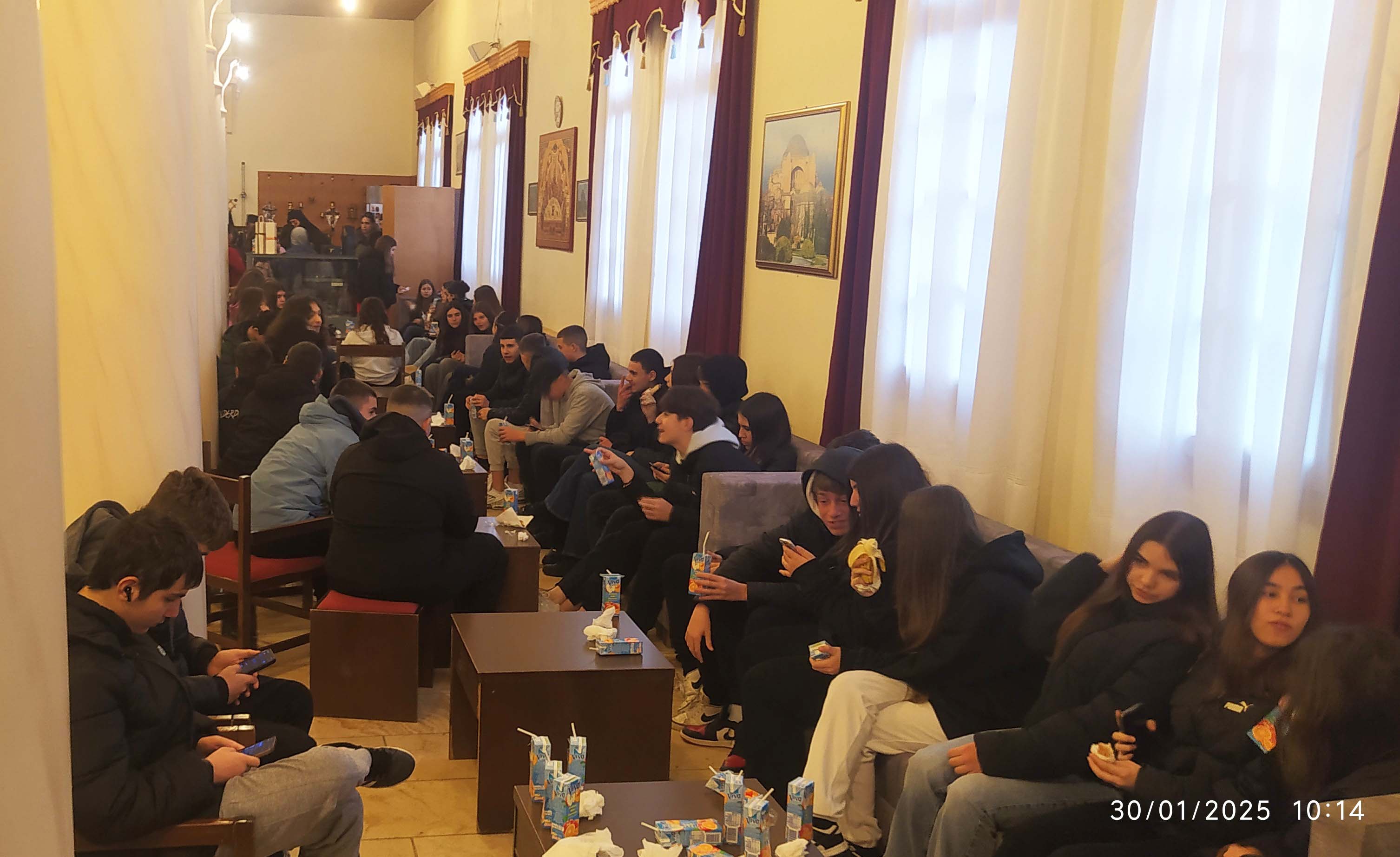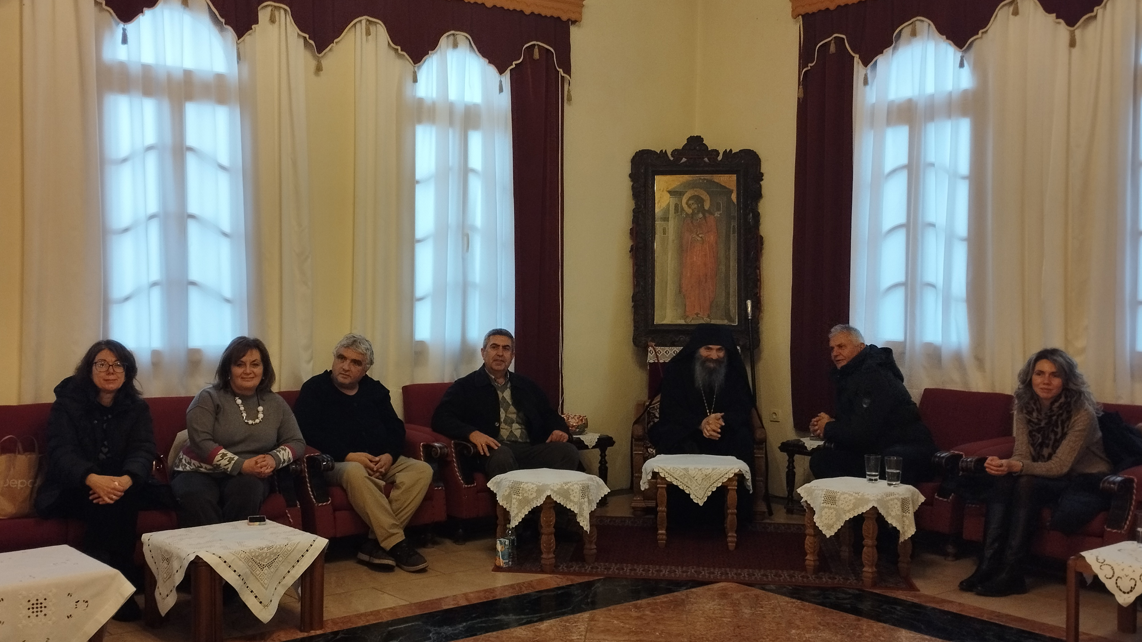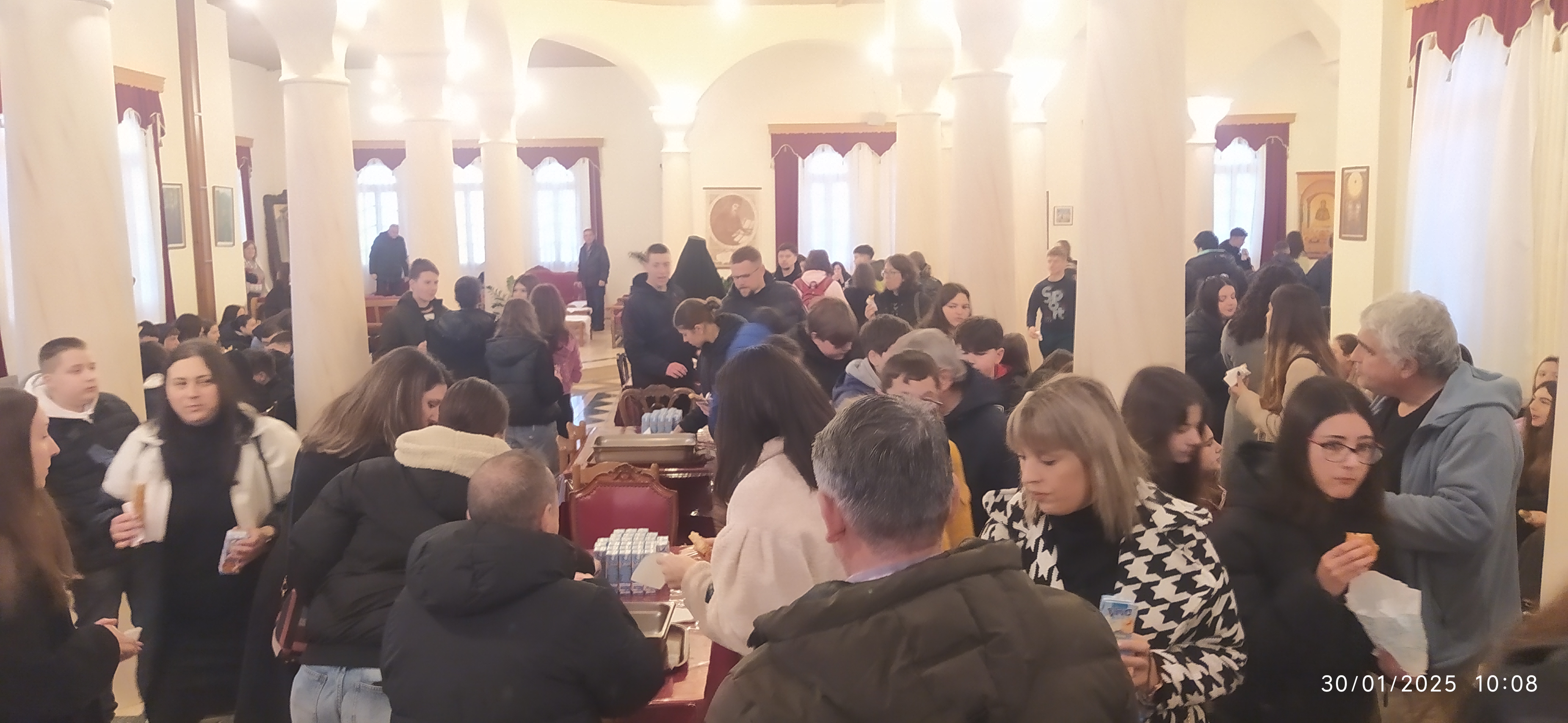 Μετά τό πέρας τῆς θείας Λειτουργίας, ὅλα τά παιδιά, μαζί μέ τούς συνοδούς Καθηγητές τους, φιλοξενήθηκαν στό μεγάλο ἀρχονταρίκι τῆς Μονῆς, ὅπου φιλοφρόνως τούς προσφέρθηκε κέρασμα ἀπό τούς Πατέρες. Ἐκεῖ οἱ συνοδοί Καθηγητές εἶχαν τήν εὐκαιρία νά συνομιλήσουν ἰδιαιτέρως μέ τόν σεβαστό Καθηγούμενο, Πανοσιολογιώτατο Ἀρχιμανδρίτη π.Χρυσόστομο.