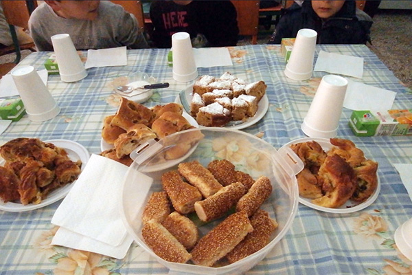 Δοκίμασαν νόστιμα ελαιόψωμα και κουλούρια, που ήταν προσφορά του φούρνου του χωριού μας. Παραδοσιακές πίτες με σπανάκι και πατάτα από το εργαστήρι παραδοσιακής πίτας κ. Tζεχιλίδη Φώτη πλούτισαν το τραπέζι μας. Τα παιδιά ήπιαν χυμούς που πρόσφερε η εκκλησία, χαμομήλι από την πρώτη τάξη και νηστίσιμα γλυκά από τους εκπαιδευτικούς.