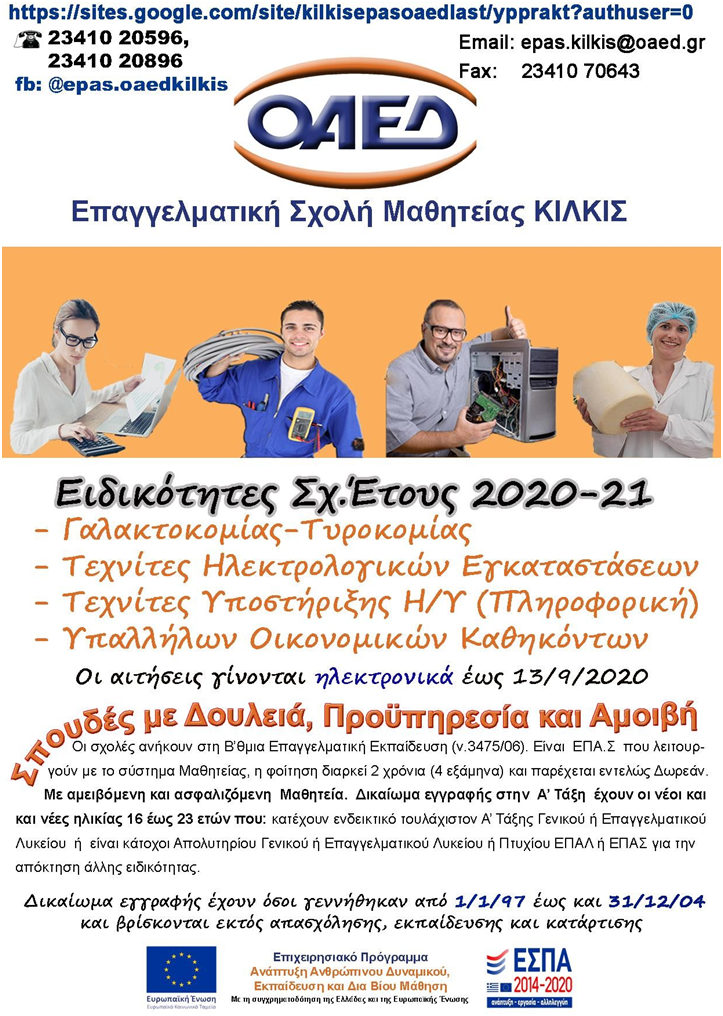 Οι ειδικότητες στην Επαγγελματική Σχολή Μαθητείας του ΟΑΕΔ ΚΙΛΚΙΣ για το έτος κατάρτισης 2020-2021 έχουν εξαιρετικό ενδιαφέρον και μεγάλη επαγγελματική αποκατάσταση και είναι οι εξής: